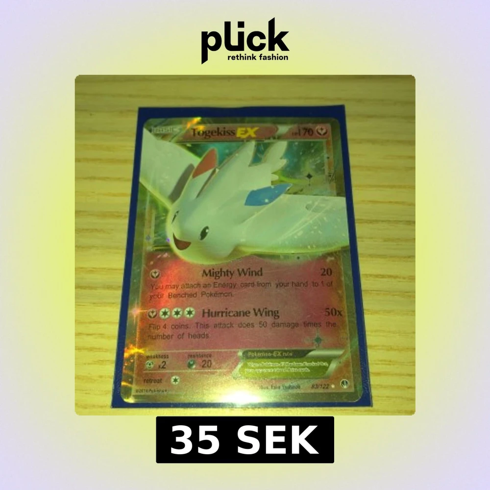 Säljer ett Togekiss EX Pokémonkort med 70 HP. Kortet har attacker som Mighty Wind och Hurricane Wing. Det är en del av serien 83/122 och har en holografisk yta. Perfekt för samlare eller Pokémon-entusiaster! Den har pytte lite vit på kanten men annars är den bra sckick. Så klart är den riktig
