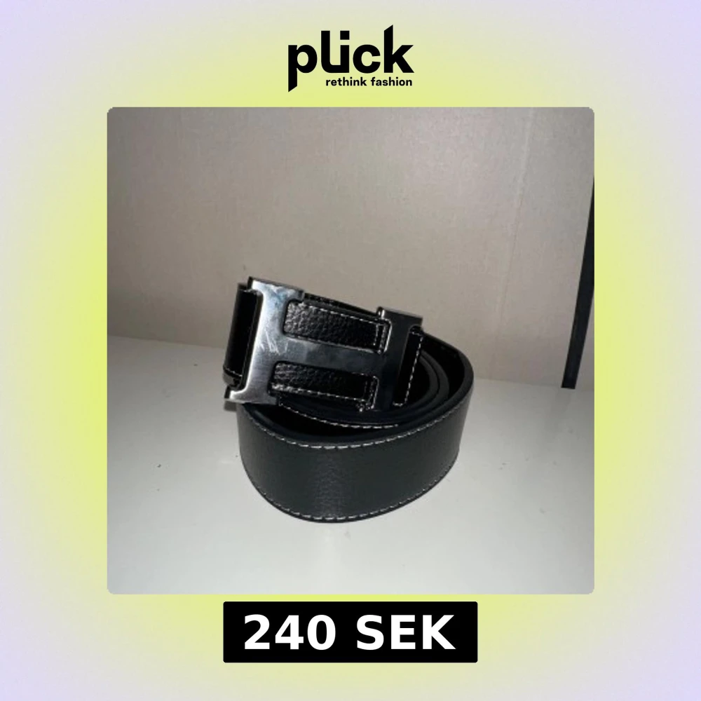 Snyggt svart her-més bälte med ett stort, blankt metallspänne och vita kontrastsömmar längs kanterna. Bältet har en stilren design och är tillverkat i skinn. Perfekt accessoar för att lyfta din outfit. 100cm