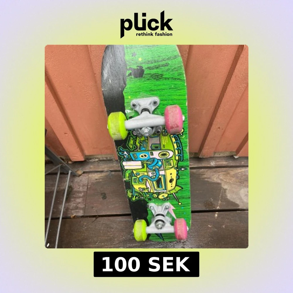 Säljer en skateboard med grön bräda och i gult, blått och svart. Ovansidan har svart griptape med neonfärgade stjärnor och blixt. Hjul i neonrosa och neongult. Perfekt för dig som gillar färg och unika brädor!