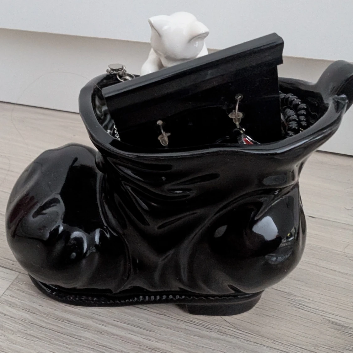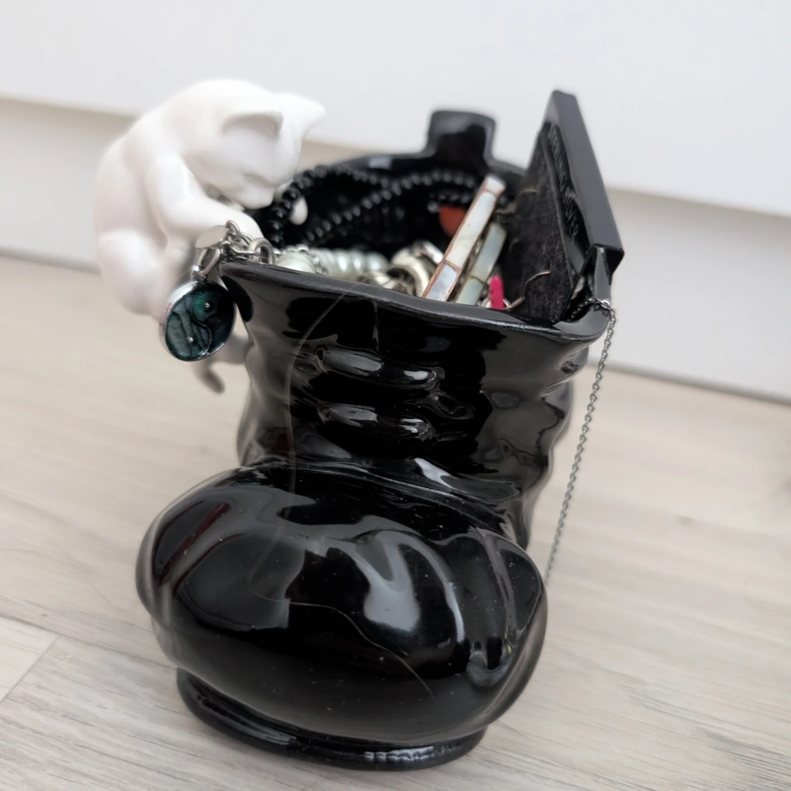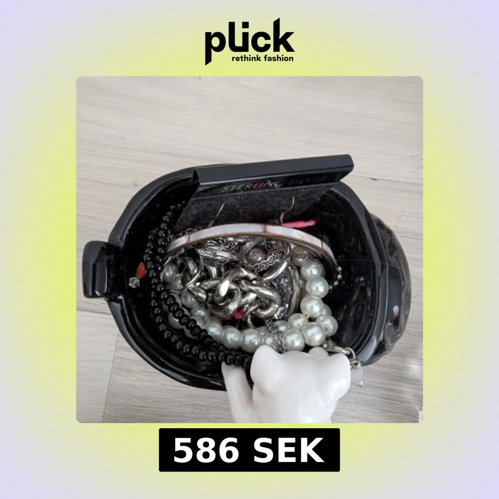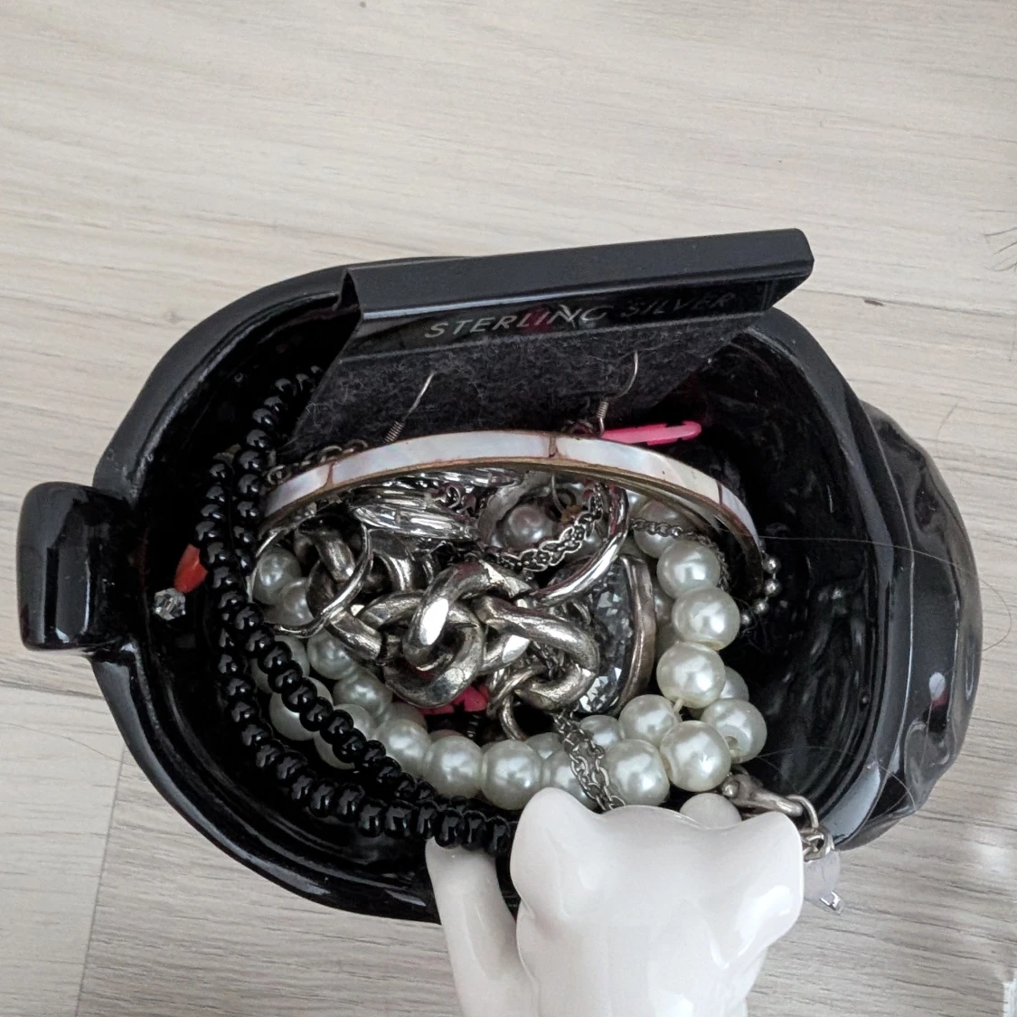 Säljer ett smyckespaket med blandade vintage armband, halsband och örhängen i silverfärg och pärlor. Innehåller chunky kedjor, vita pärlor och svarta detaljer. Kommer i en cool svart keramiksko med en vit katt på kanten. Perfekt för dig som gillar att mixa olika stilar.