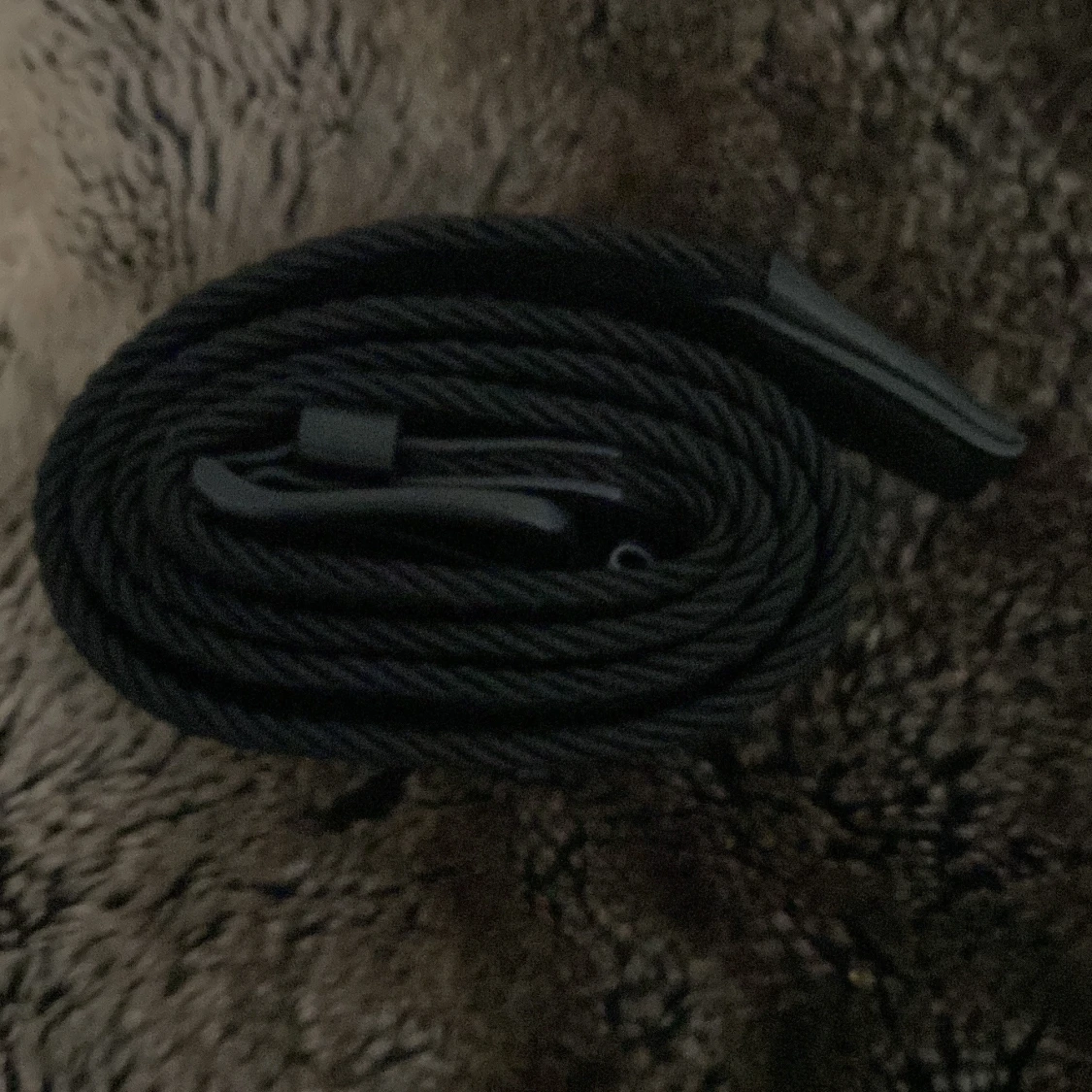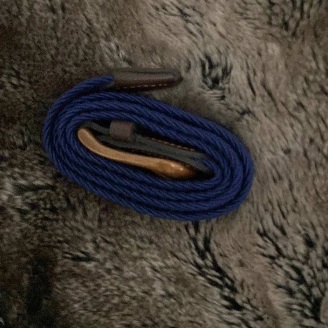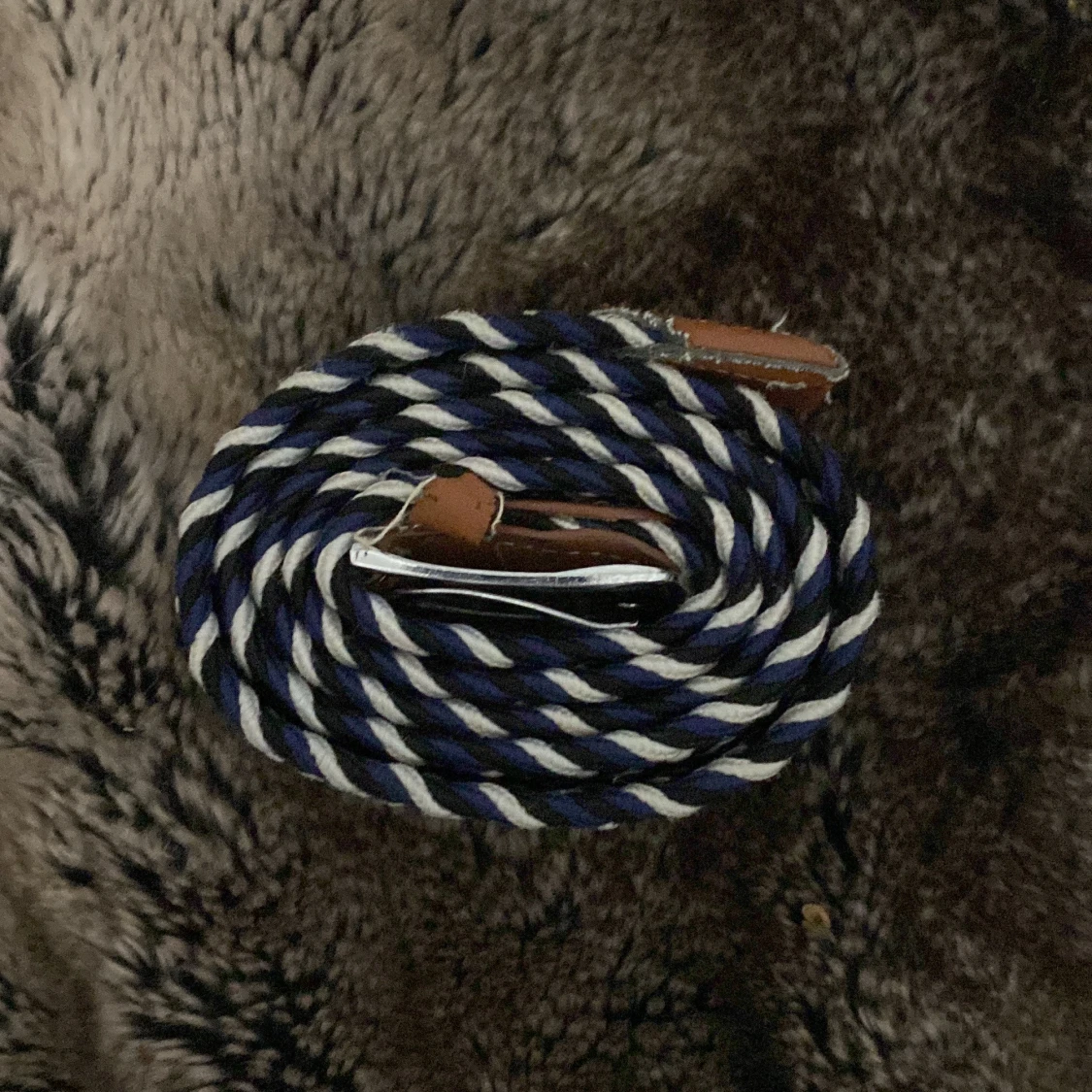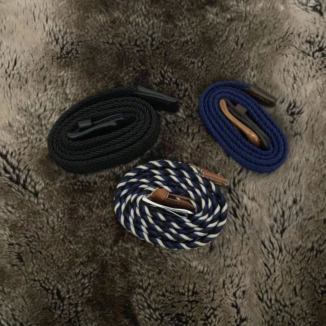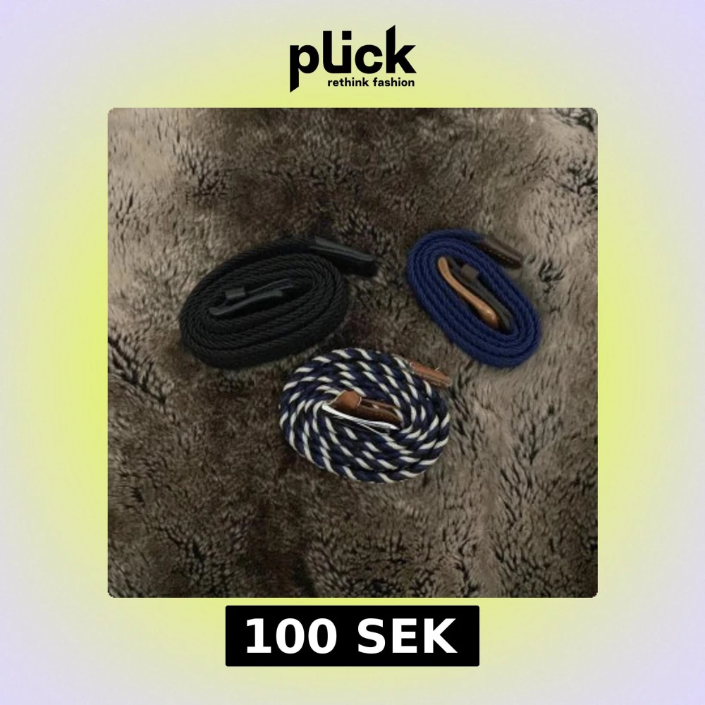 Säljer tre snygga flätade bälten: ett helsvart, ett marinblått och ett randigt i blått, svart och vitt. Alla har detaljer i brunt läder och metallspänne. Perfekt accessoar för att lyfta din outfit med en sportig och stilren touch. De svart, blå och vit randiga bältet är i sämre skick men dom andra två är i bra skick! Säljer alla tre för 100 men 35kr styck. Kom med bud och frågor!