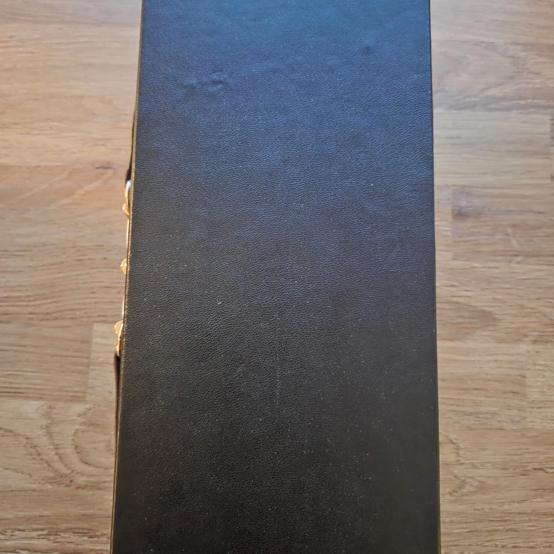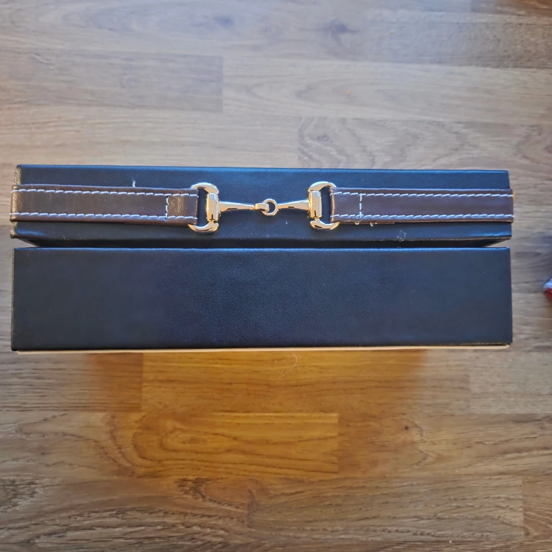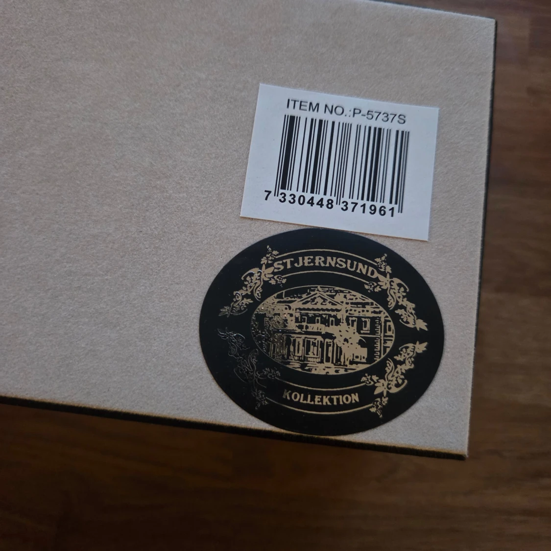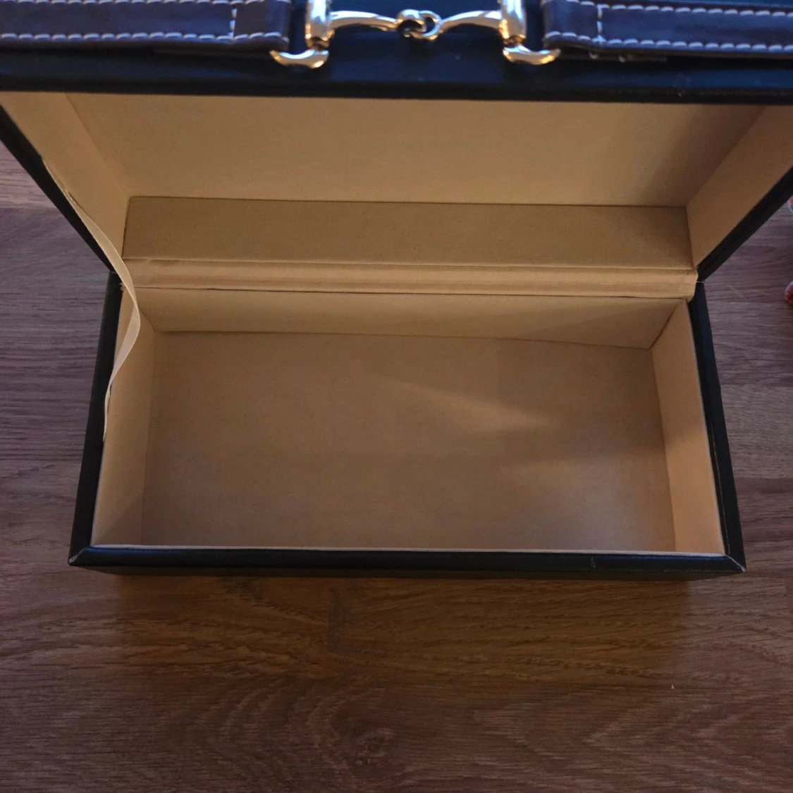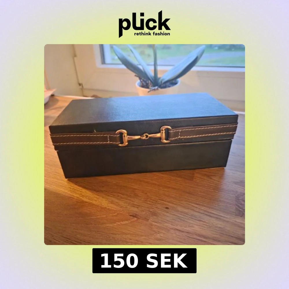Snyggt svart smyckeskrin från Stjernsund Kollektion med guldfärgad metallspänne och kontrastsömmar. Skrinet har en stilren, rektangulär form och är klädd i skinnimitation. Insidan är ljusbeige och rymlig. Mått 7 x 10 x 21 cm. Nyskick, aldrig använd. Endast upptagen ur förpackningen för att kunna fotografera den.