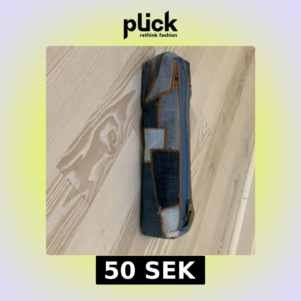Säljer en unik plånbok i patchwork denim med olika blå nyanser och synliga orange sömmar. Väskan har en metallfärgad dragkedja längs ovansidan och är smal och avlång i formen. Perfekt för att hålla ordning på småsaker i väskan.