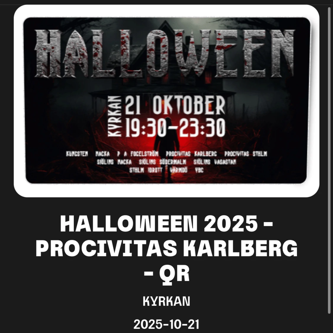 21 October 19:30-23:30. Plats: Kyrkan, globen/gullmarsplan(Stockholm). Halloween fest för ettor och tvåor på gymnasiet.