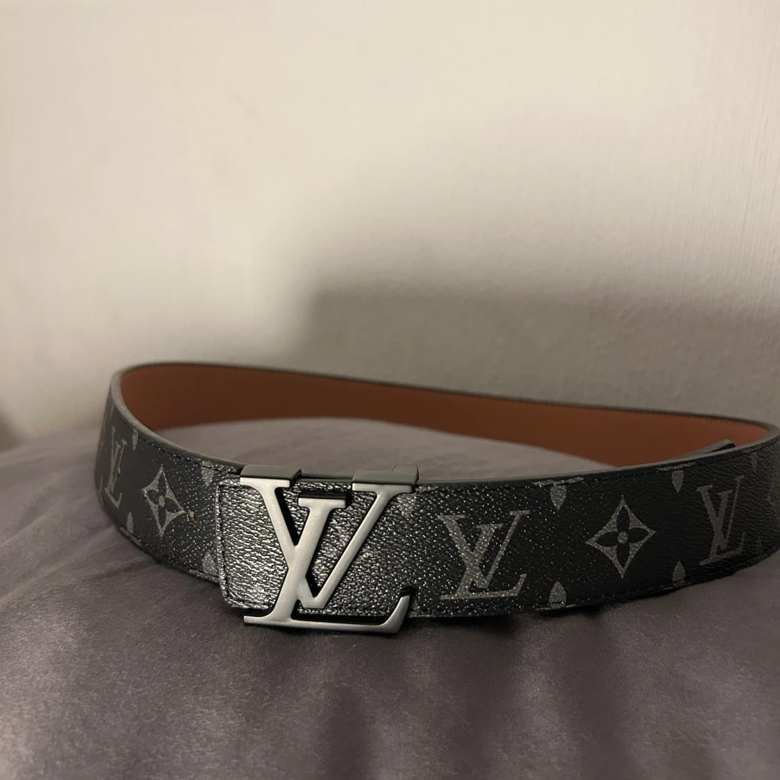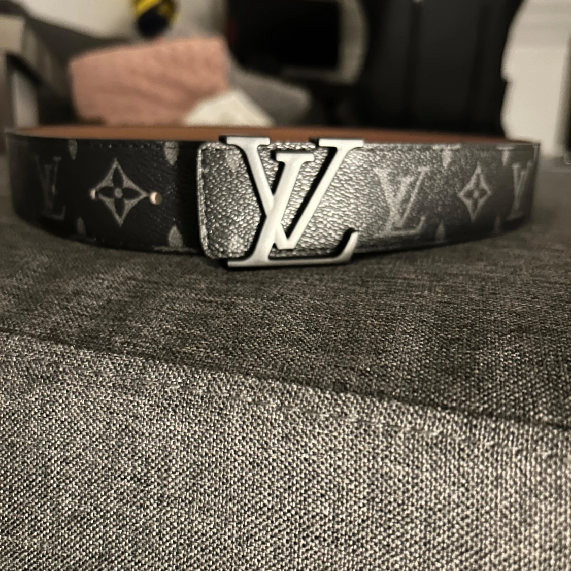 Snyggt svart bälte med klassiskt monogrammönster och en stilren svartfärgad spänne. Bältet har en brun insida.