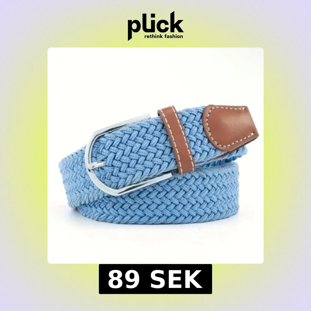 Säljer ett ljusblått flätat bälte med silverfärgat spänne och bruna skinn-detaljer vid spännet och änden. Bältet har en elastisk känsla och passar perfekt till jeans eller chinos.