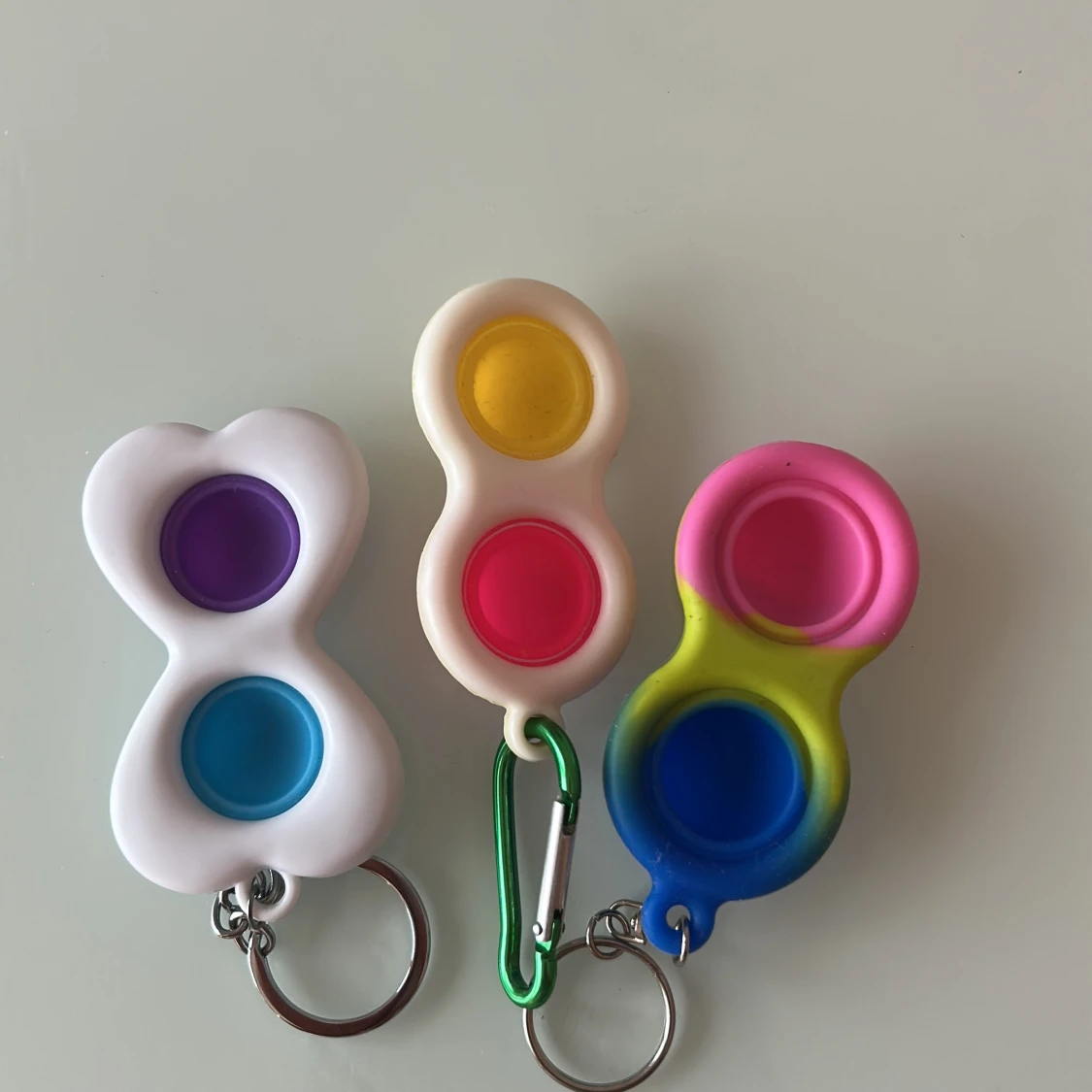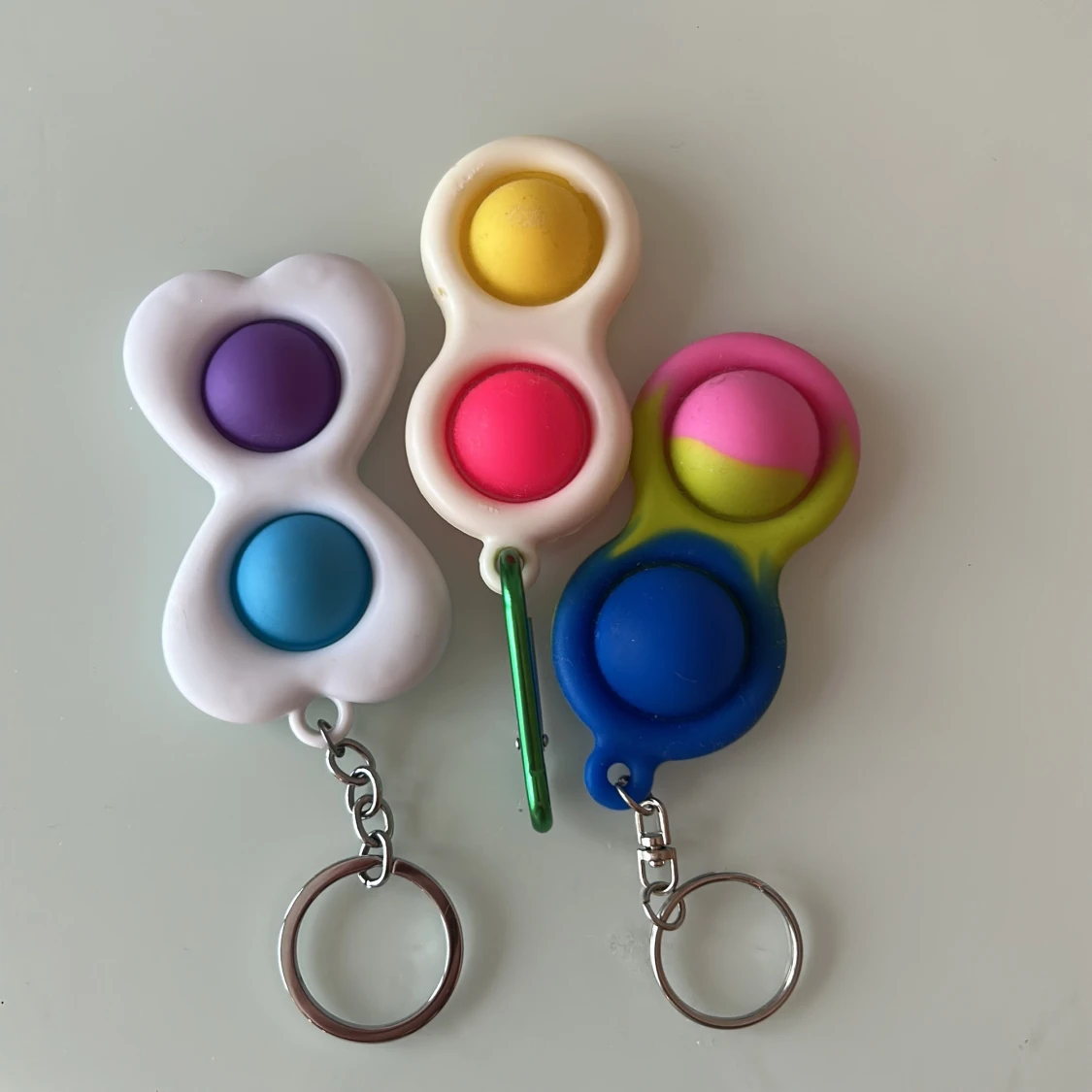 Säljer ett set med tre fidget popper nyckelringar i olika färger och former. Perfekt som stressleksak eller för att hålla händerna sysselsatta. Alla poppers är i gott skick utan synligt slitage. Nyckelringar och karbinhake ingår.