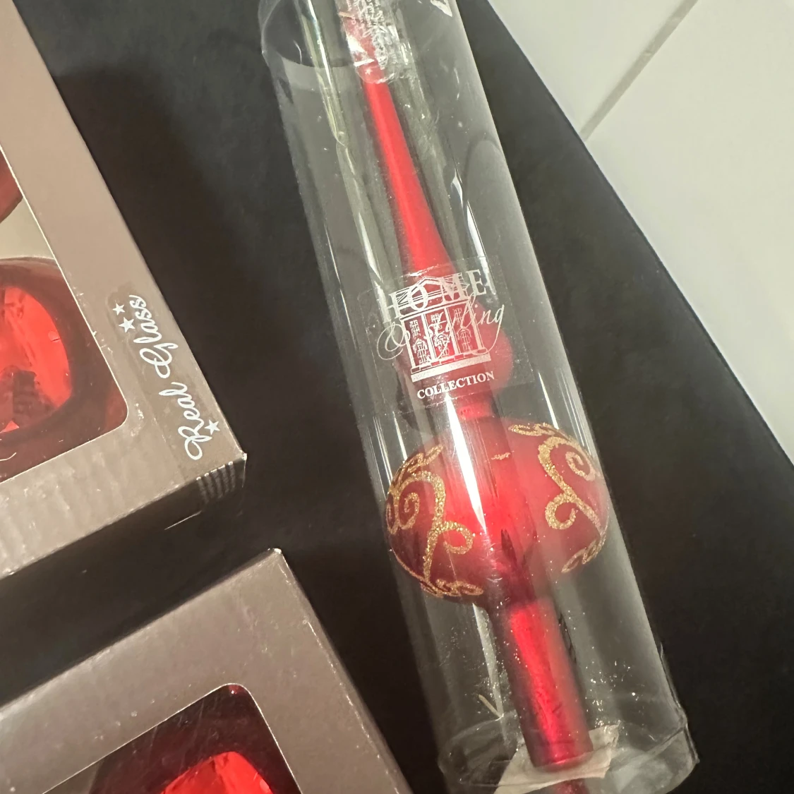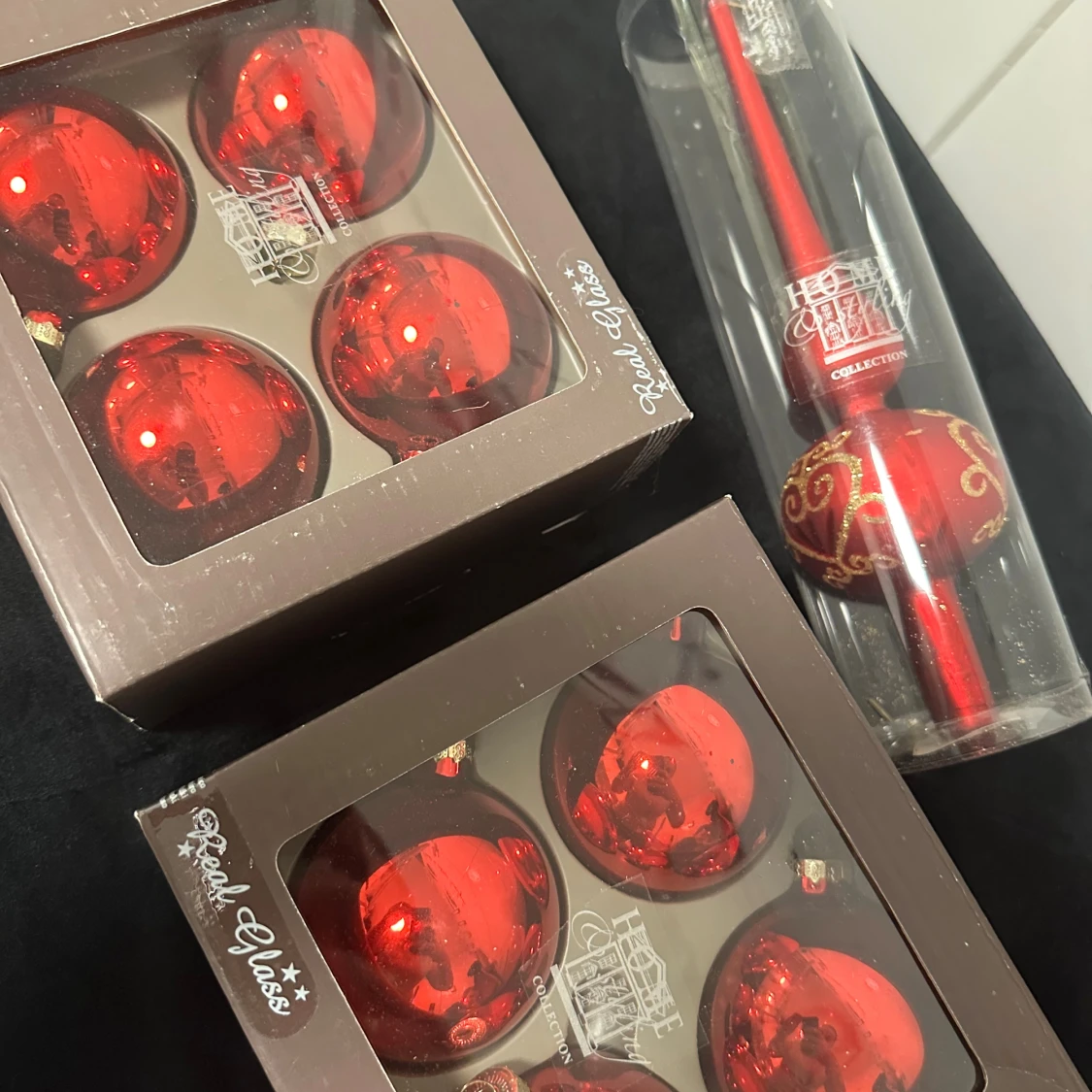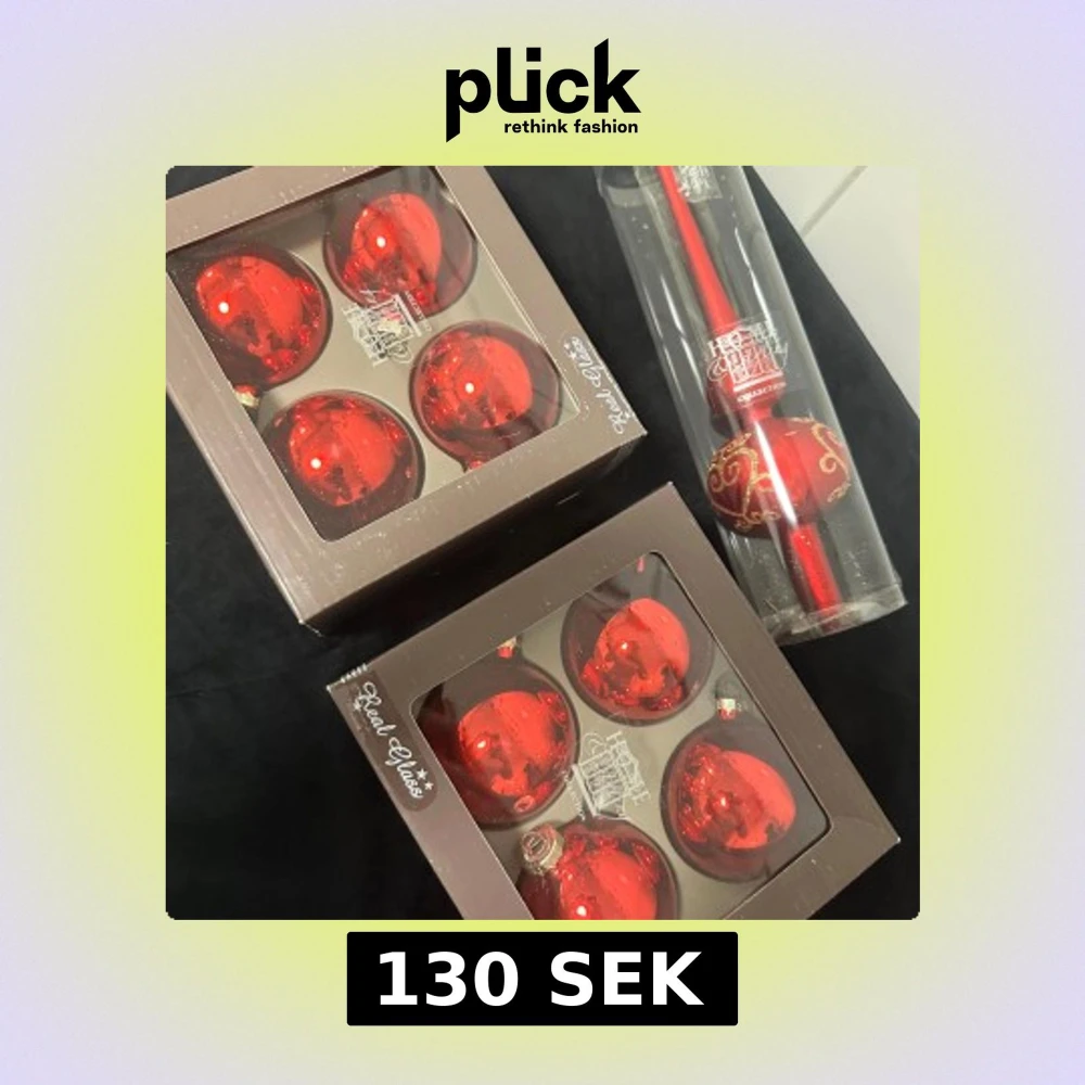 Bilderna visar julgranskulor och en julgransspira i rött glas från Home Living Collection. Produkterna är i originalförpackning och ser oanvända ut, utan synligt slitage eller defekter. Perfekt för att dekorera julgranen med klassisk och elegant stil.