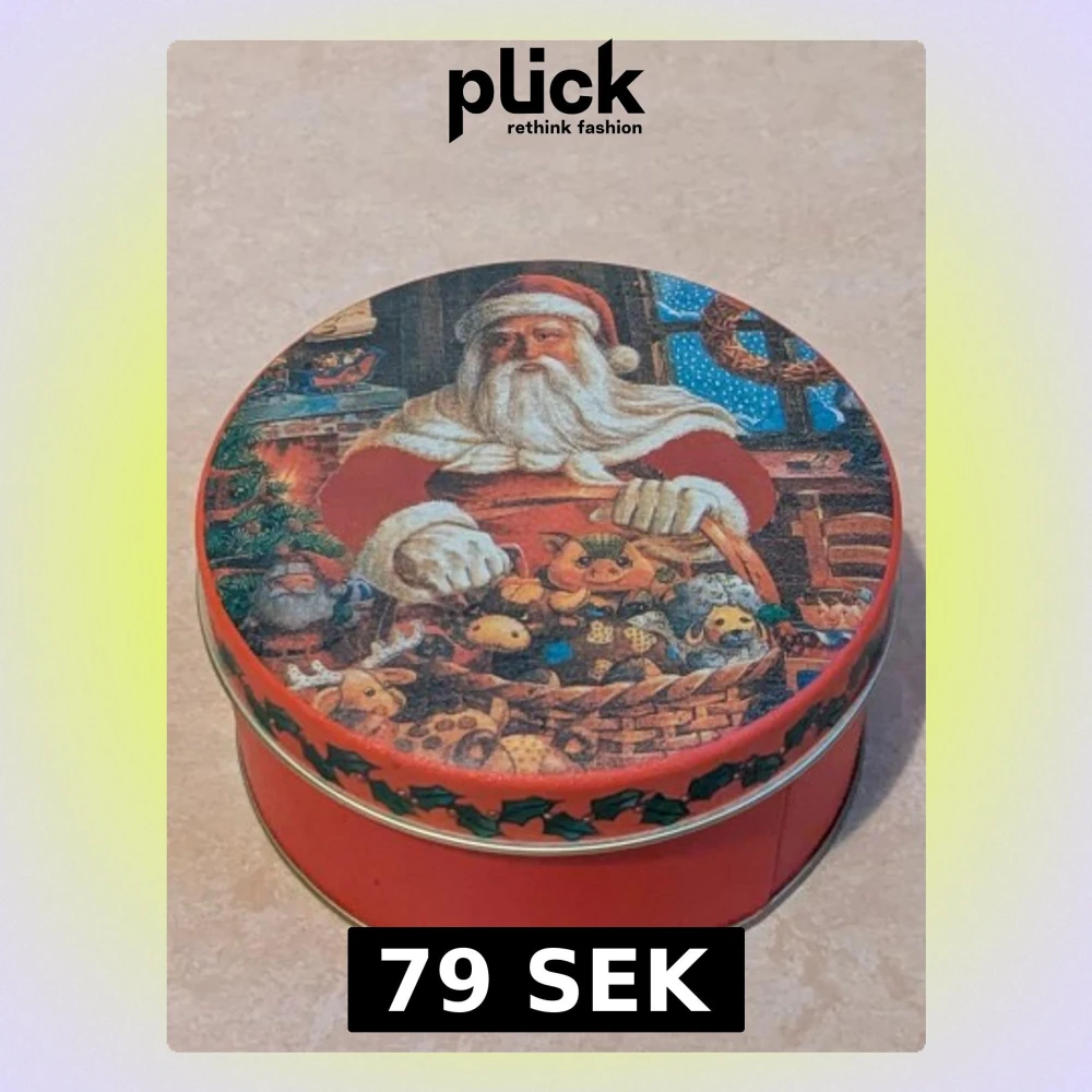 Burk av metall med julmotiv. Jätte fin metallburk med en jultomte som julmotiv. På sista bilden visas en bild med en jätte liten defekt, färgen saknas på en jätte liten bit