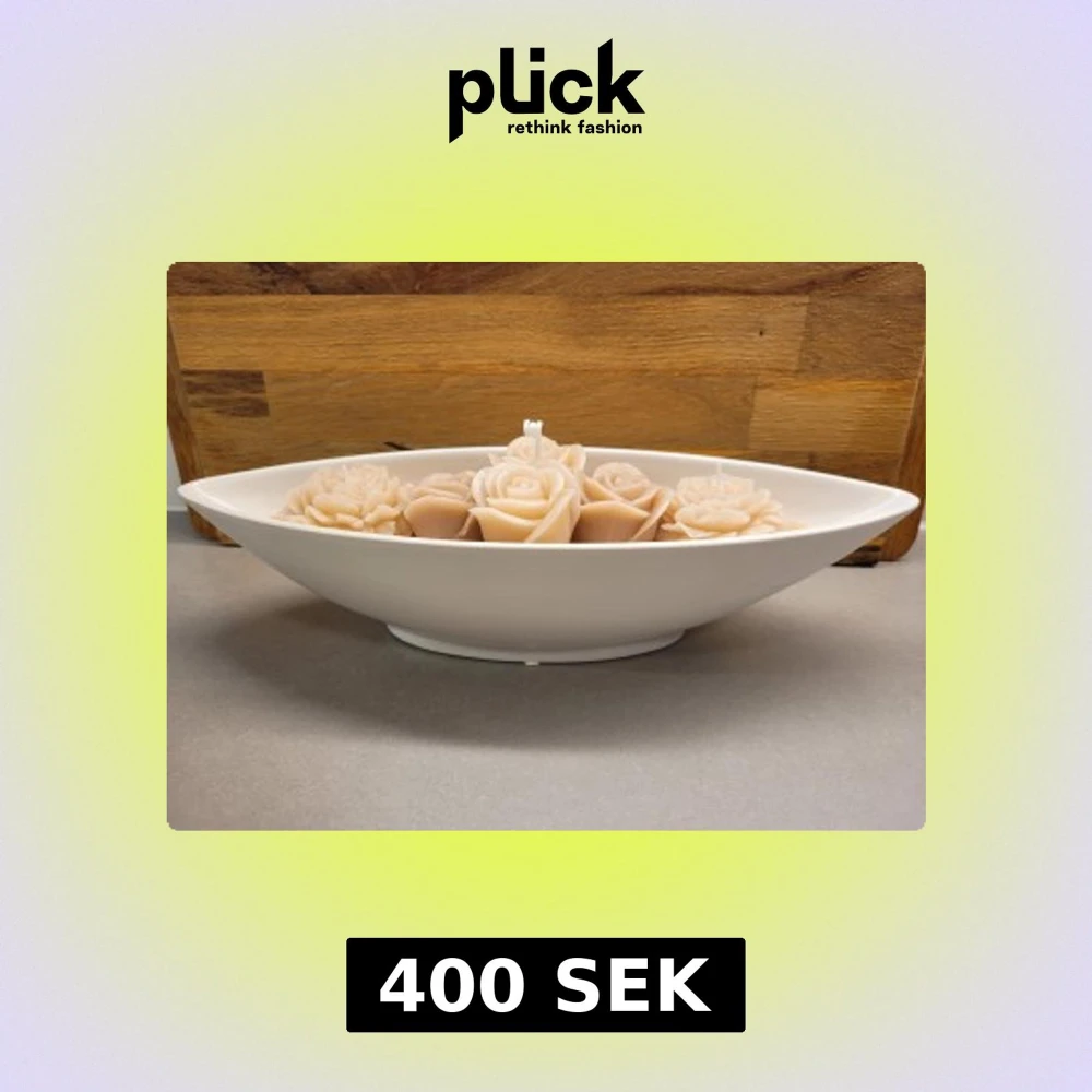 Bilderna visar en dekorativ skål med rosformade ljus i beige nyans. Ljuset är konstnärligt utformat och passar perfekt som bordsdekoration eller present. Ljuset är med 3 stjälkar. En svag doft av jasmin.