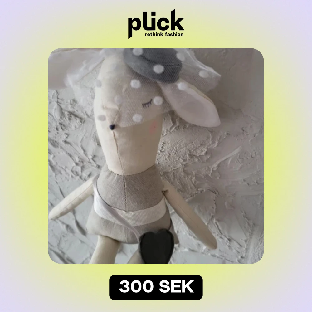 Storlek: H 40 cm Färg: Beige Material: Bomull och tyll Fyllning: Polyester silikonfyllning Underhåll: De kan rengöras med mild tvål och vatten. Ögon och näsa är handbroderade,armar och ben rör sig och alla kläder och accessories är avtagbara.