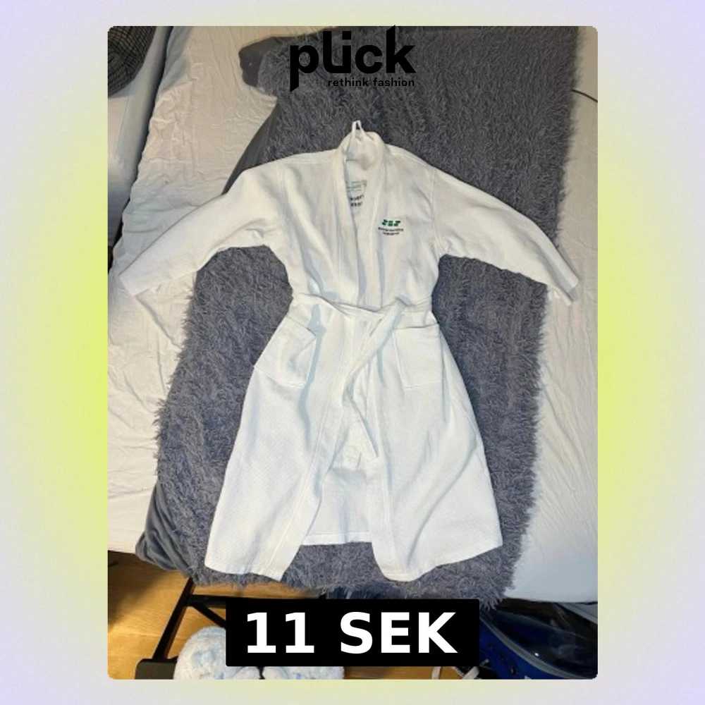 Vit badrock med broderad logga från Studentbostäder i Norden AB. Rocken har två stora fickor framtill och ett knytbälte i midjan. Materialet är bomull med en våfflad struktur som känns mjuk mot huden. Perfekt att slänga på sig efter duschen eller när du chillar hemma.