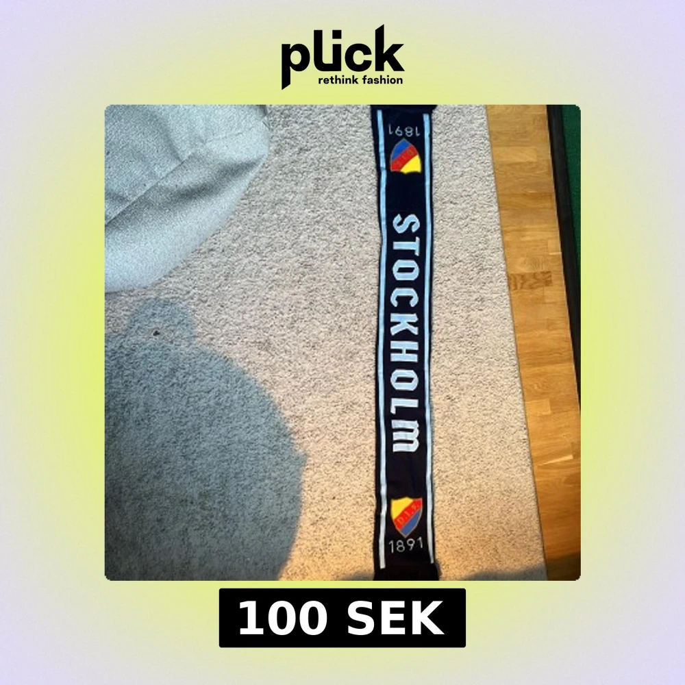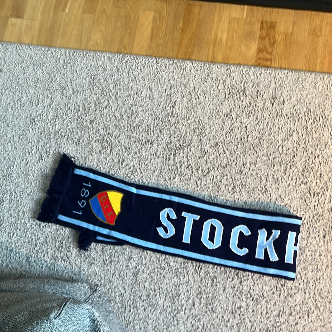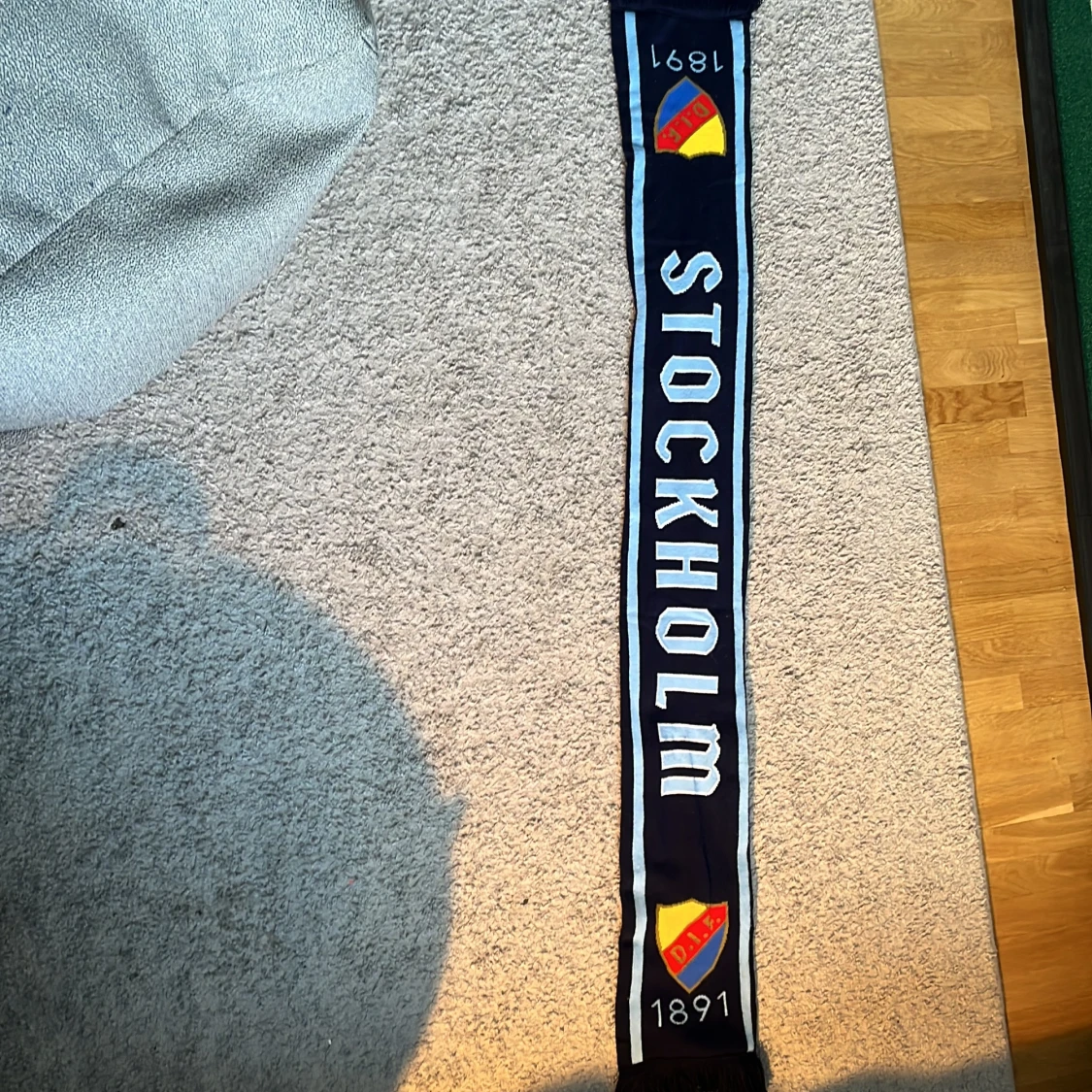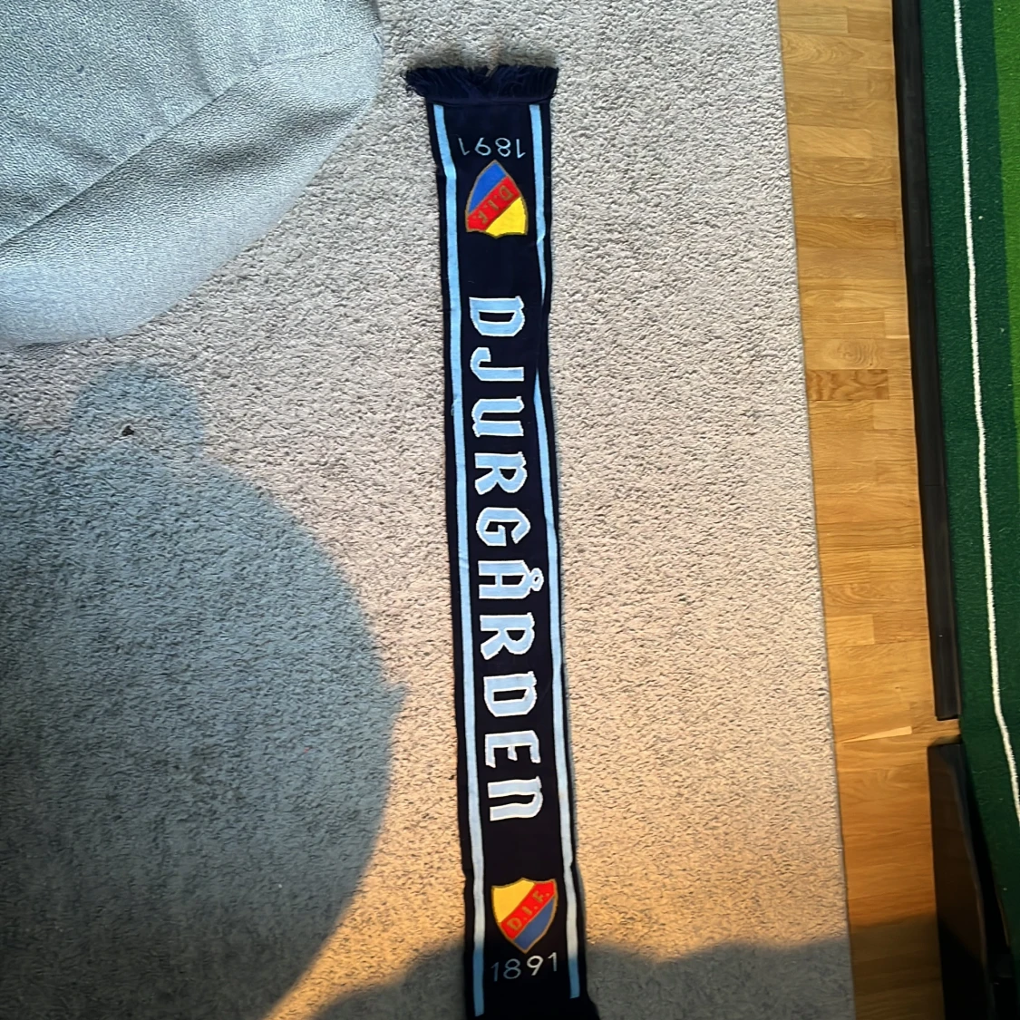 Snygg halsduk i mörkblått med ljusblå kanter och stora vita bokstäver där det står 'STOCKHOLM' på ena sidan och 'DJURGÅRDEN' på andra. Djurgårdens klassiska klubbmärke i rött, gult och blått samt årtalet 1891 på båda ändar. Perfekt för att visa ditt stöd på matchen!