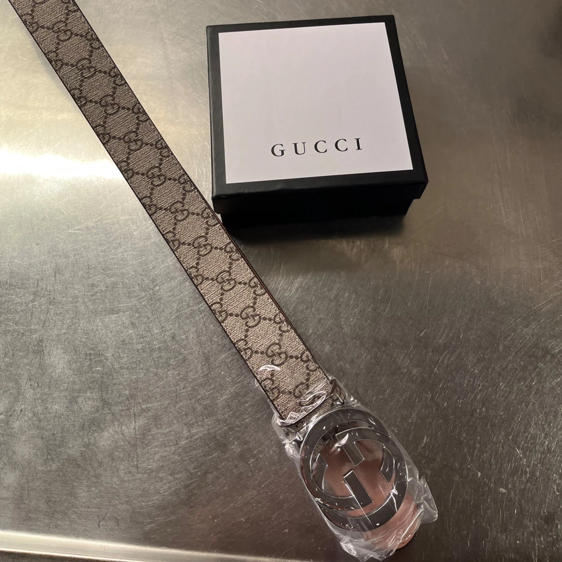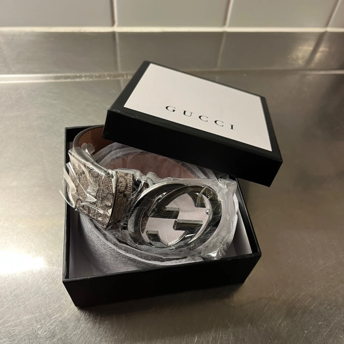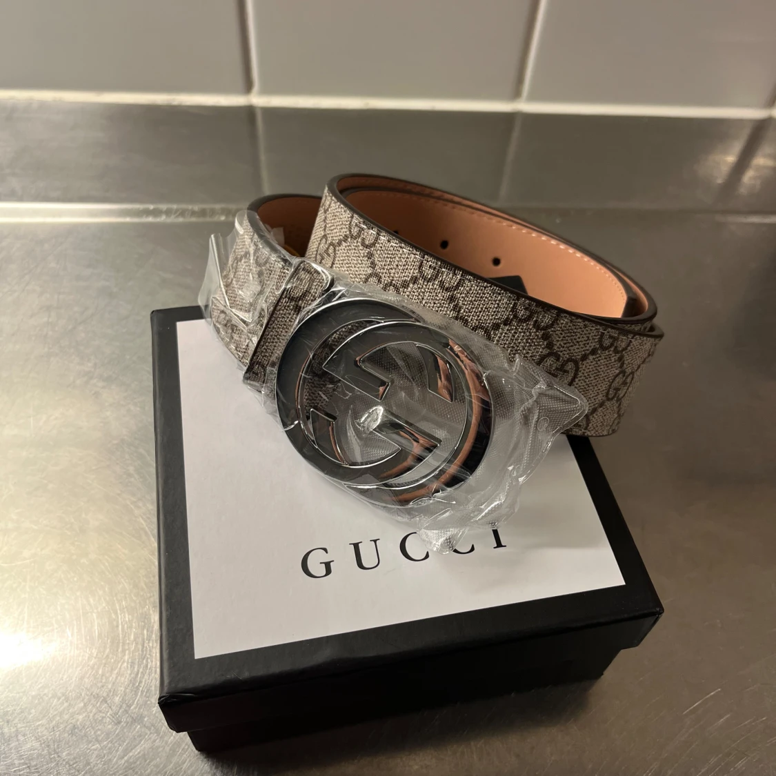 Snyggt skärp i beige med klassiskt GG Supreme-mönster och stor silverfärgad GG-spänne. Bältet är gjort i skinn och har en lyxig känsla med detaljer i brunt och beige. Perfekt accessoar för att lyfta din outfit med en exklusiv touch.