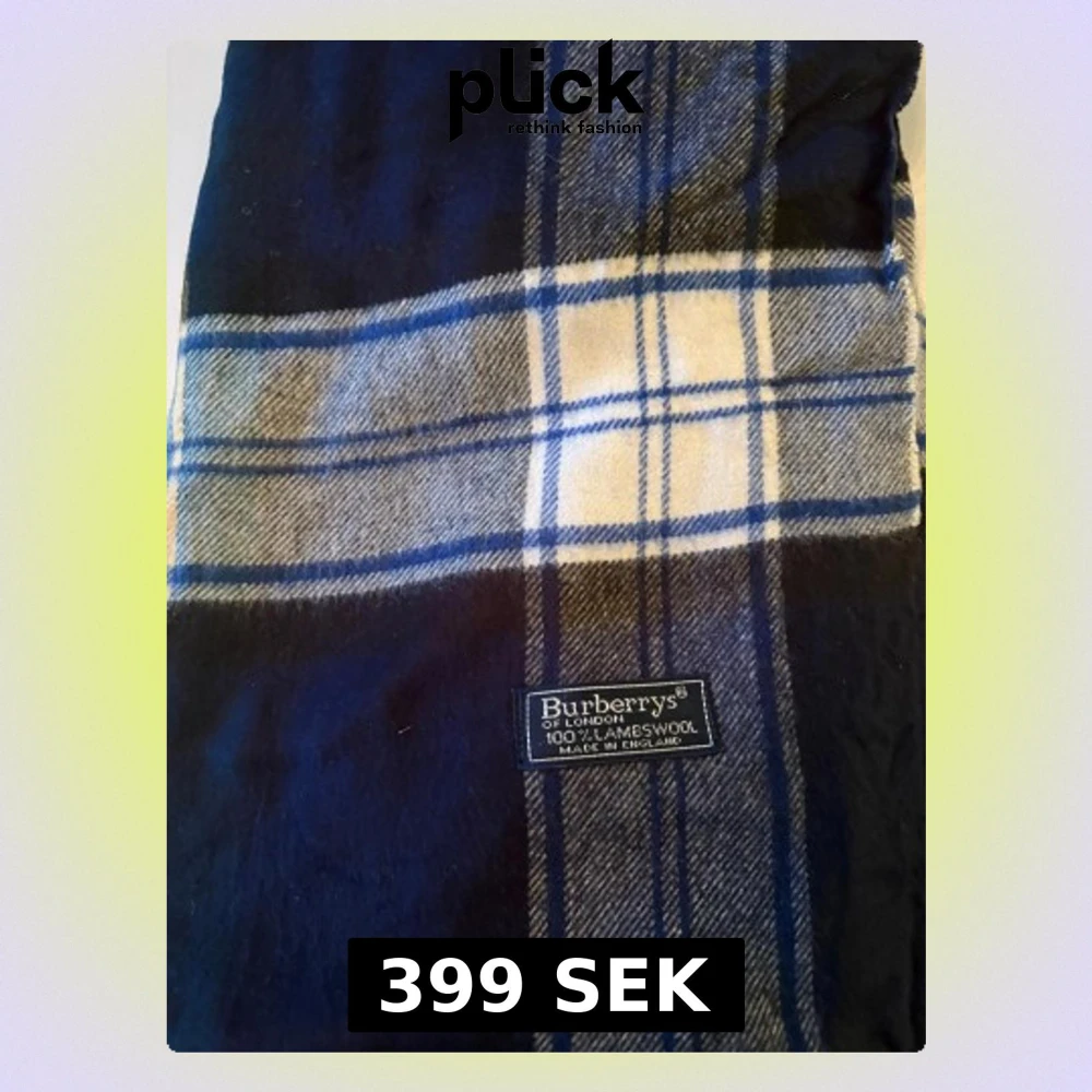 Snygg halsduk från Burberrys i 100% lammull, tillverkad i England. Den har ett klassiskt rutigt mönster i mörkblått, vitt, grått och inslag av grönt och gult. Fransen i ändarna ger en chill vibe och den är perfekt för kalla dagar.