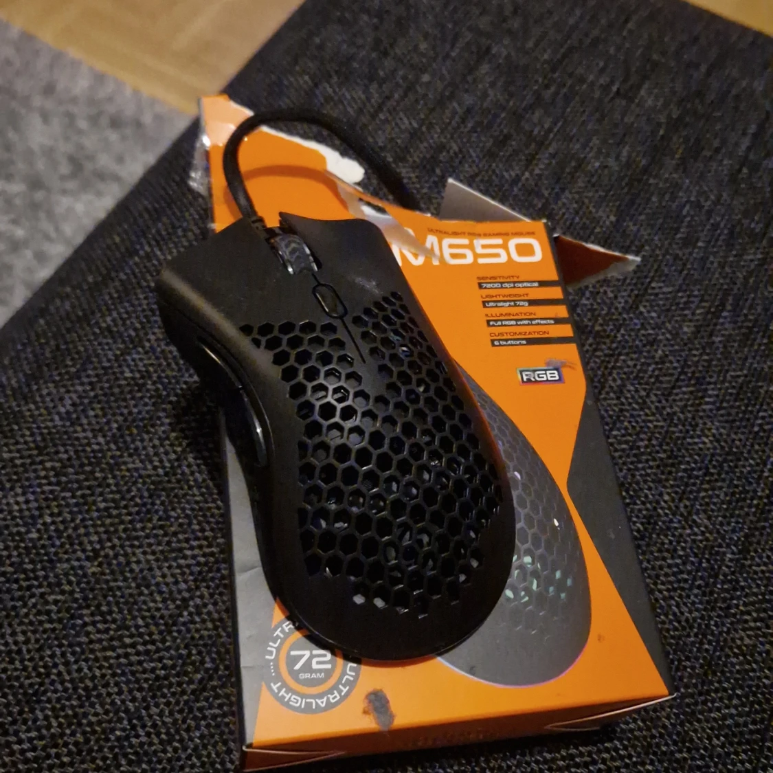 Säljer en NOS M650 ultralätt gamingmus med RGB-belysning och en vikt på 72 gram. Musen har en honeycomb-design för bättre grepp. Inkluderar även ett NOS K600 tangentbord med RGB-belysning, perfekt för gaming.