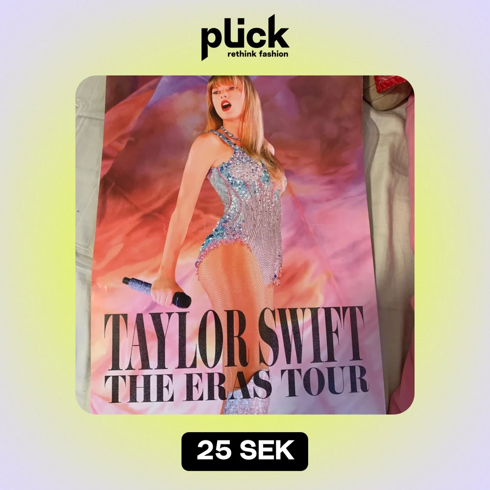 Snygg poster med Taylor Swift från The Eras Tour. Den har en färgglad bakgrund med Taylor i en glittrig klänning och mikrofon i handen. Perfekt för fans som vill dekorera sitt rum med en ikonisk bild från turnén.