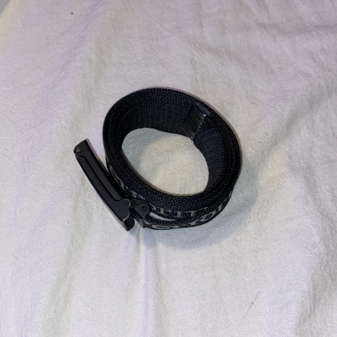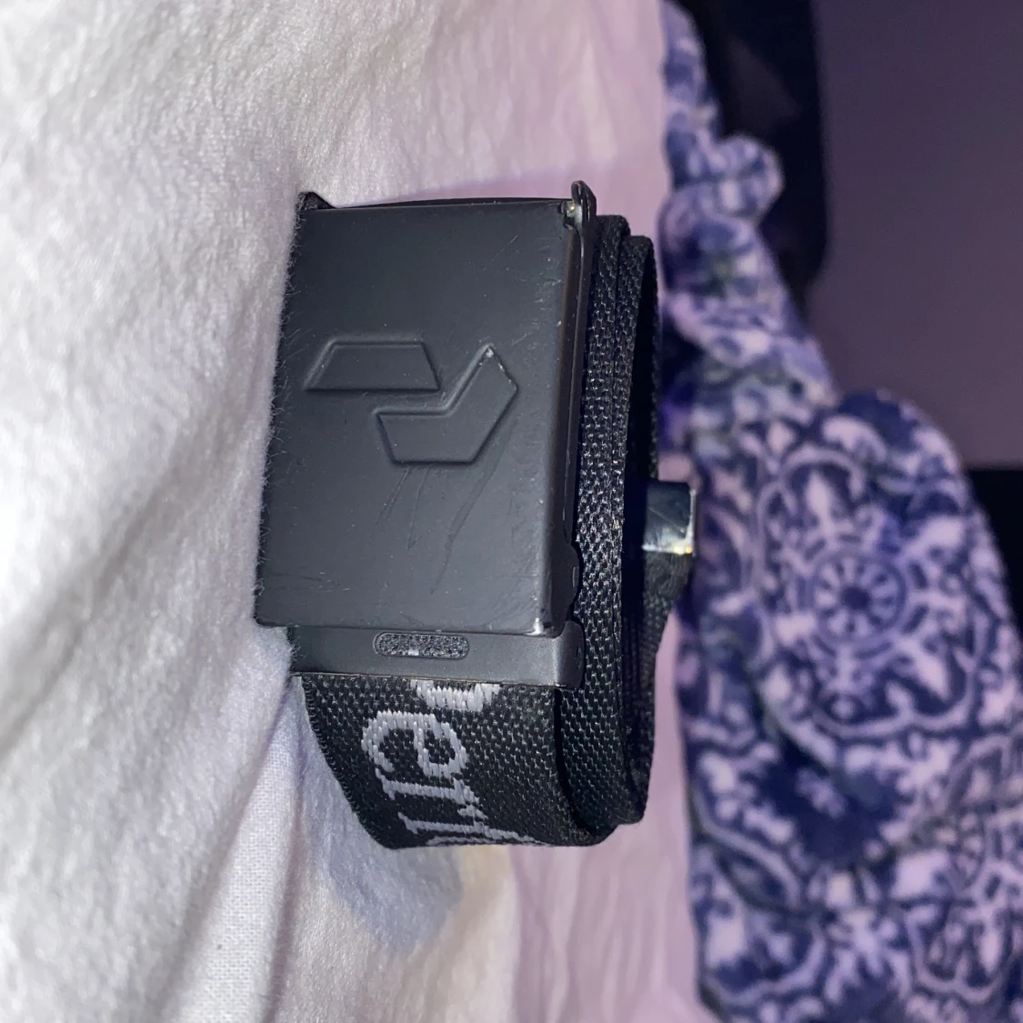 Säljer ett svart bälte från Peak med metallspänne och präglad logga på spännet. Bältet är gjort i slitstark textil och har vit text längs bandet. Perfekt accessoar för att lyfta din outfit.
