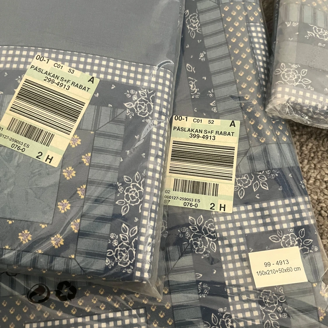 Fint blått mönster med blommor, rutor och små detaljer. Passar enkelsäng. Alla set är helt nya och oanvända, fortfarande i originalförpackning. På ett av seten har plasten spruckit lite, men det är fortfarande helt nytt och oanvänt. (Sista bilden) Alla fyra för 180 kr📩 Skicka gärna ett meddelande vid frågor eller om du vill ha flera bilder! 🌸😊 📦 Jag skickar snabbt och packar alltid med omsorg!