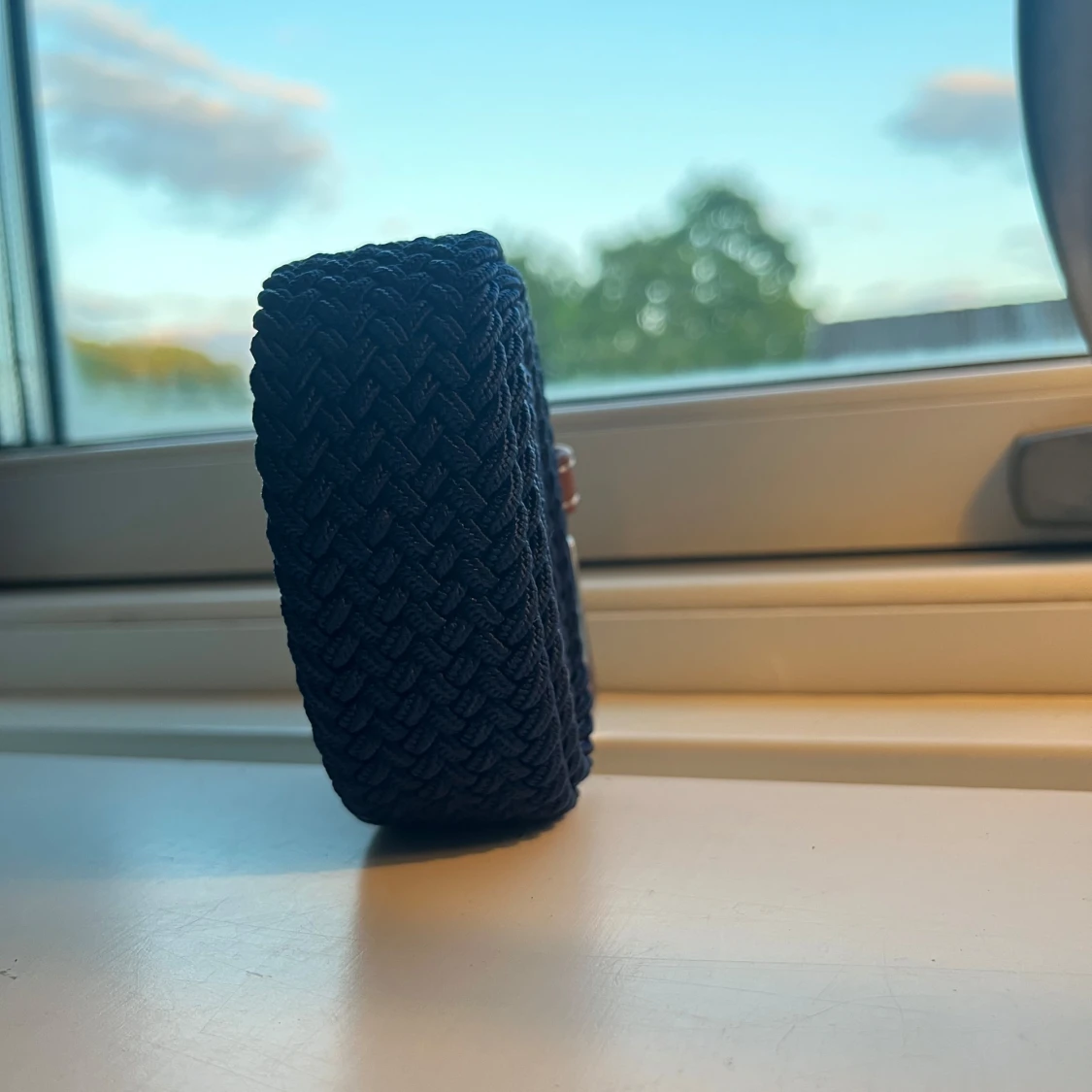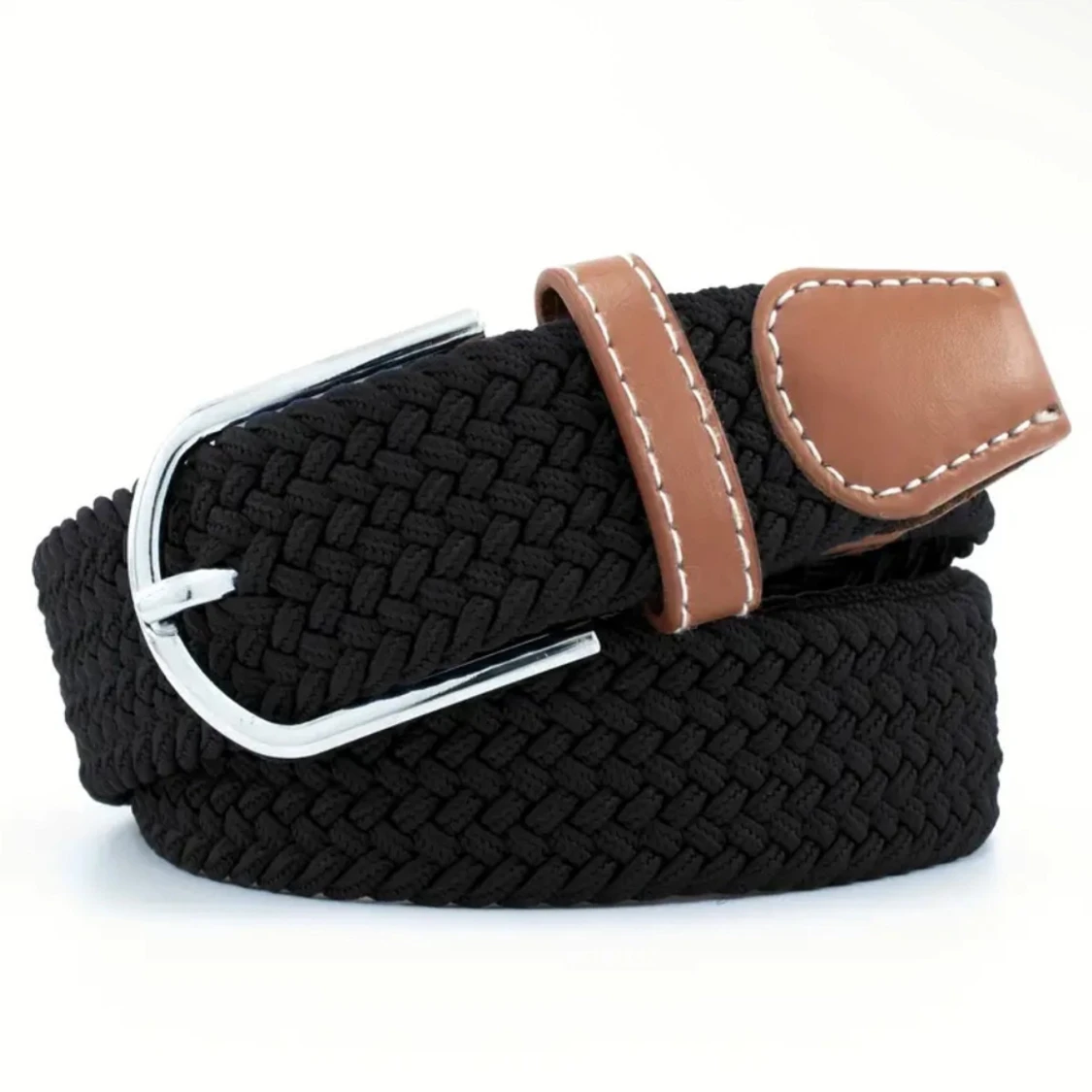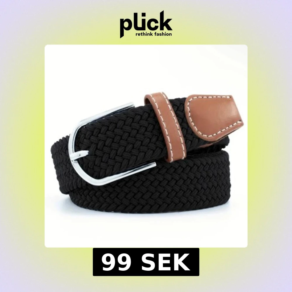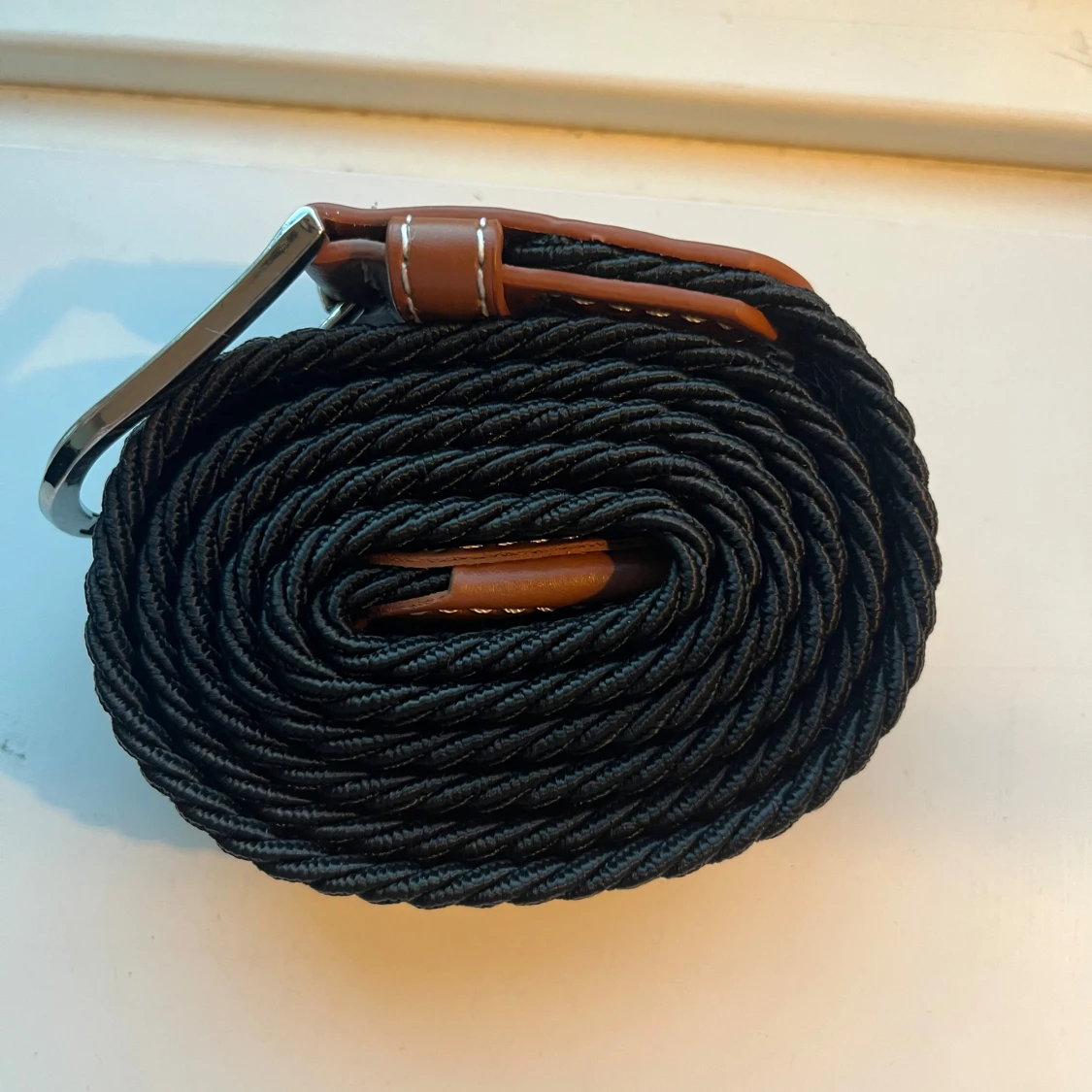 Snyggt svart flätat bälte med bruna skinn-detaljer och silverspänne. Perfekt accessoar för att lyfta din outfit. Bältet har en klassisk design med kontrastsömmar på skinnet och passar till många olika stilar.