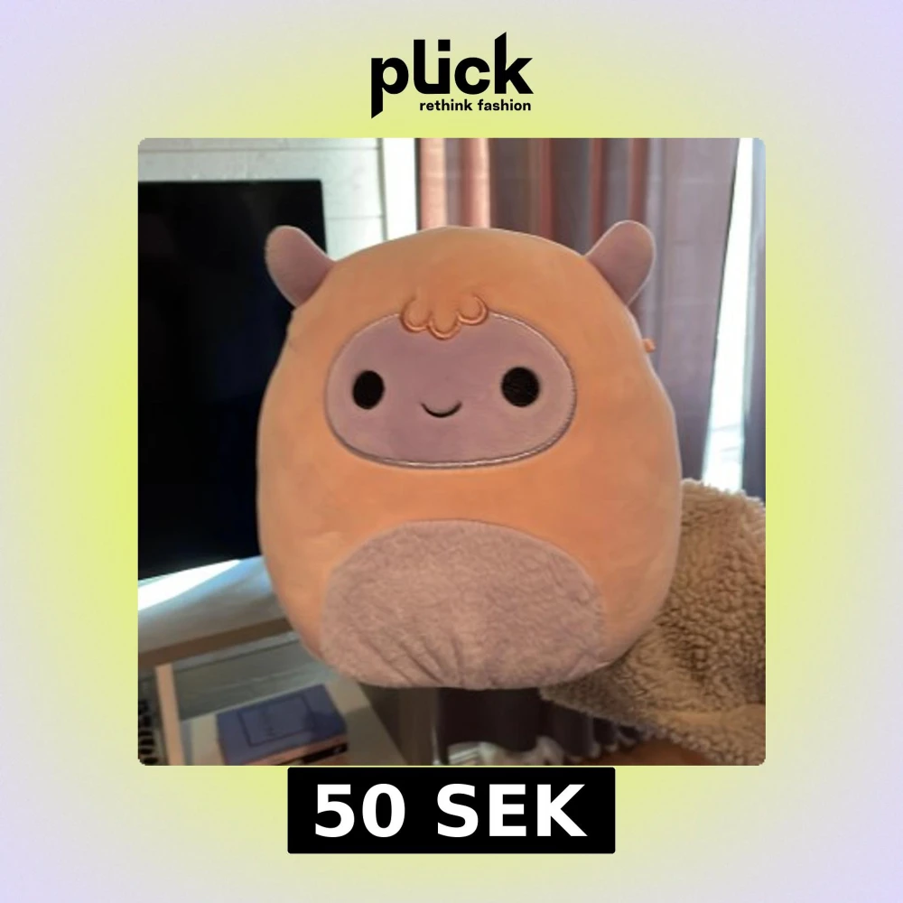 Supermjuk och rund Squishmallows gosedjur i lila och beige med sött ansikte och små öron. Perfekt som kramkompis eller dekoration. Märkt med original Squishmallows-tag.