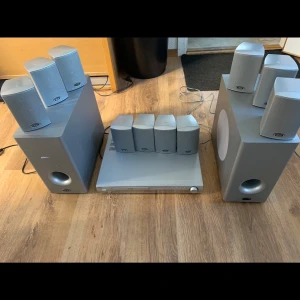 Säljer ett komplett hemmabiosystem med flera högtalare och två subwoofers i grått. Perfekt för att skapa en bioliknande ljudupplevelse hemma. Systemet inkluderar en central enhet och flera mindre högtalare för surroundljud.