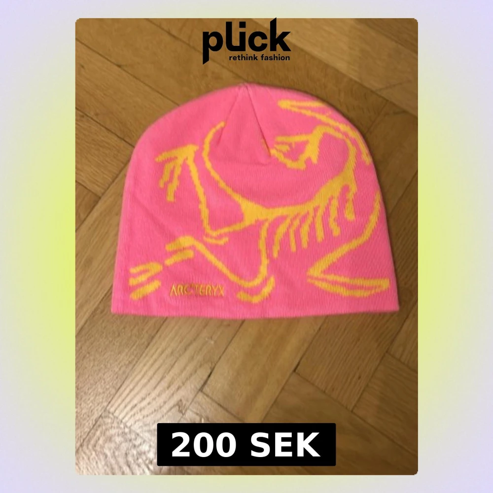 Bilderna visar en rosa mössa från Arc'teryx med gul logga och motiv, inte en väst. Kan ej ge västbeskrivning eller taxonomier.