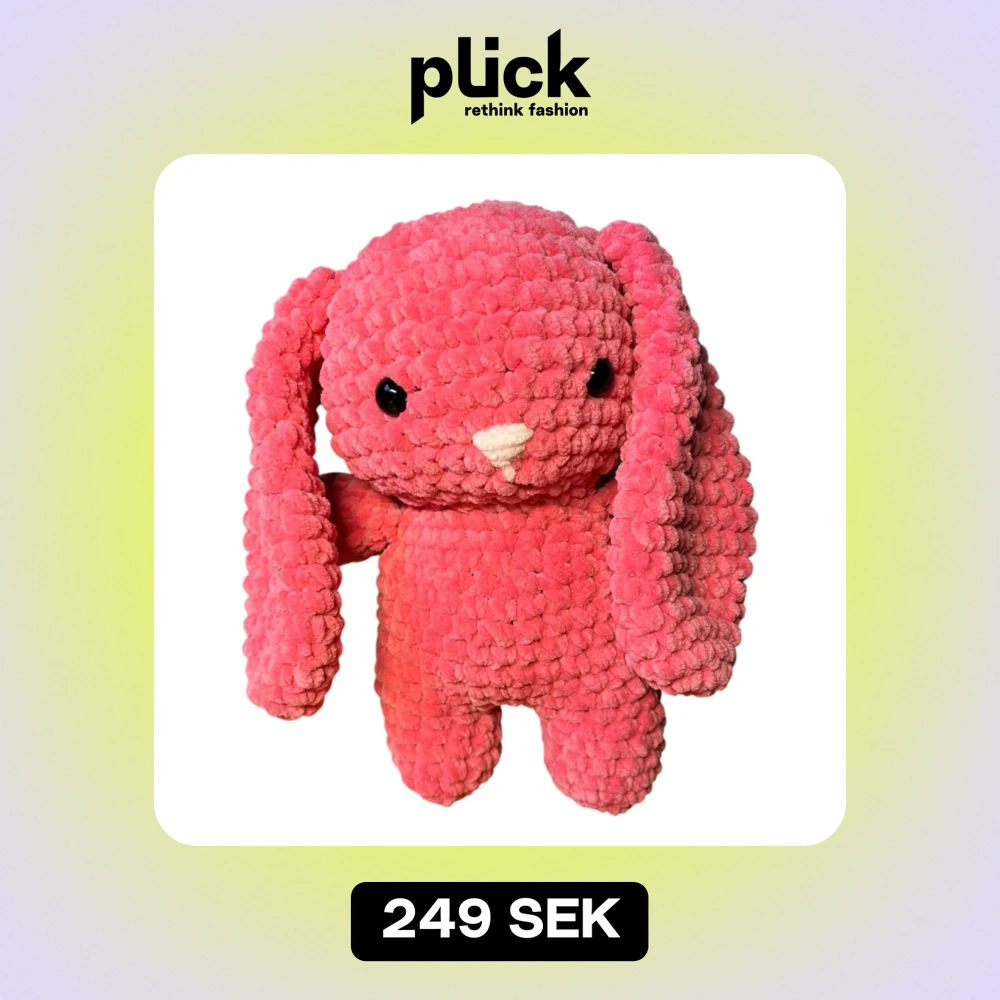 Virkad kanin av mig med broderad nos, garnet är 100% polyester. Den rosa färgen är aningen kallare i verkligheten. Observera att kaninen har säkerhetsögon, dessa rekommenderas inte för barn under 3 år. Mått: ca 27 cm hög, ca 15 cm bred