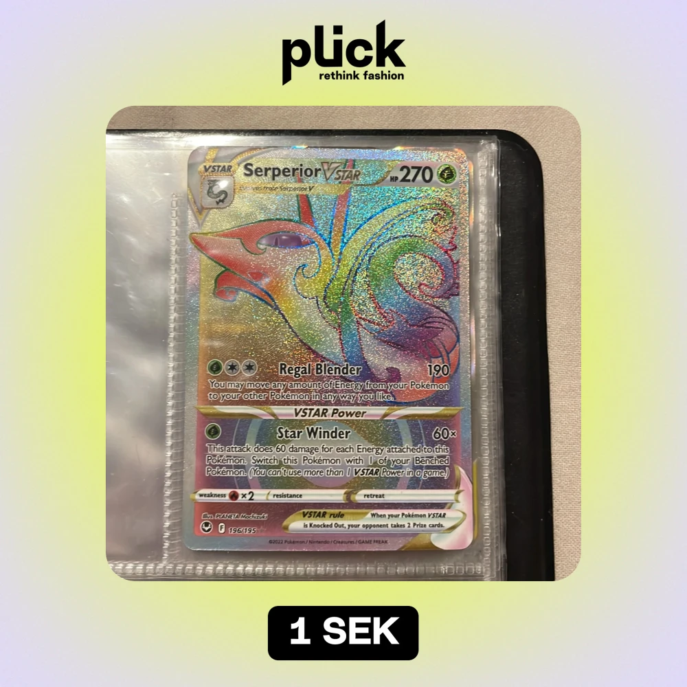 Säljer ett glittrande Serperior VSTAR Pokémonkort med 270 HP. Kortet har en färgglad design med en regnbågsskimrande yta. Det har attacker som Regal Blender och Star Winder. Perfekt för samlare eller Pokémon TCG-spelare som vill stärka sin kortlek. Kortet är i fint skick och förvaras i en plastficka för extra skydd. Vet inte hur mkt den går för så lägg bud!