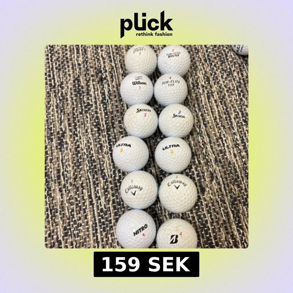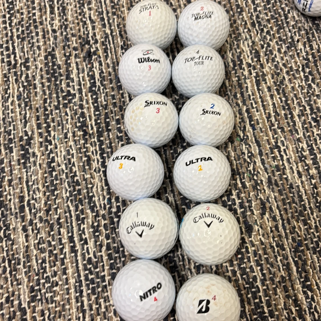 Bilden visar flera golfbollar av olika märken, t.ex. top flite,Wilson ,srixon ,ultra,callaway,nitrogen och b