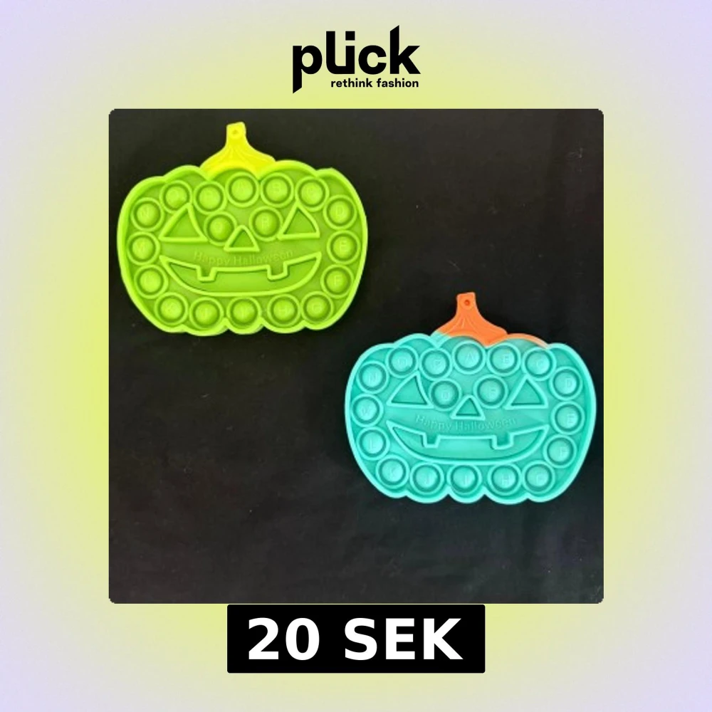 Två pop it-leksaker i form av pumpor med texten 'Happy Halloween'. En är grön med gul stjälk och den andra är turkos med orange stjälk. Båda har utstansade ansikten och rundade former, perfekta för Halloween-tema.