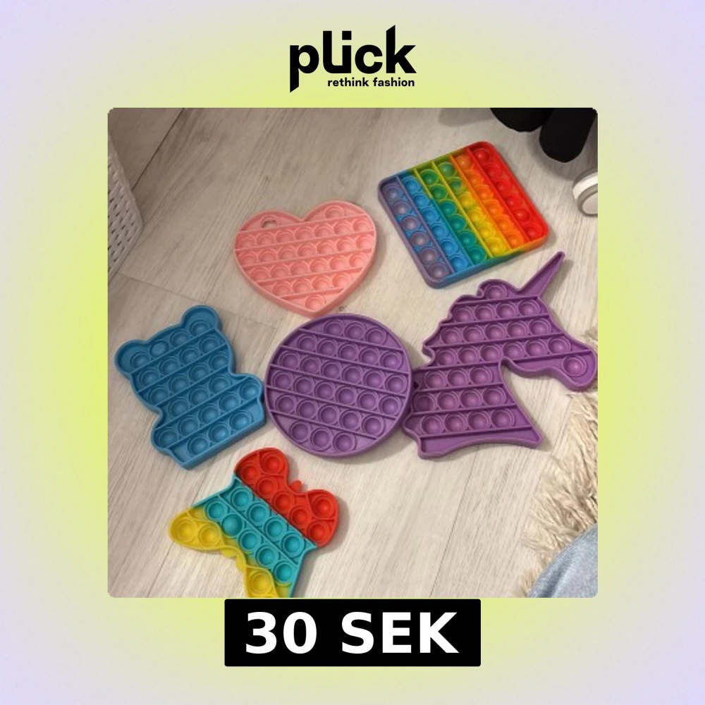 Färgglad samling av 6 Pop It fidget-leksaker i olika former: hjärta, cirkel, enhörning, björn, fjäril och regnbågsfyrkant. Tillverkade i silikon, i mycket fint skick utan synligt slitage. Perfekt för stresslindring och sensorisk lek.❌Det rosa hjärtat saknar en pop it❌