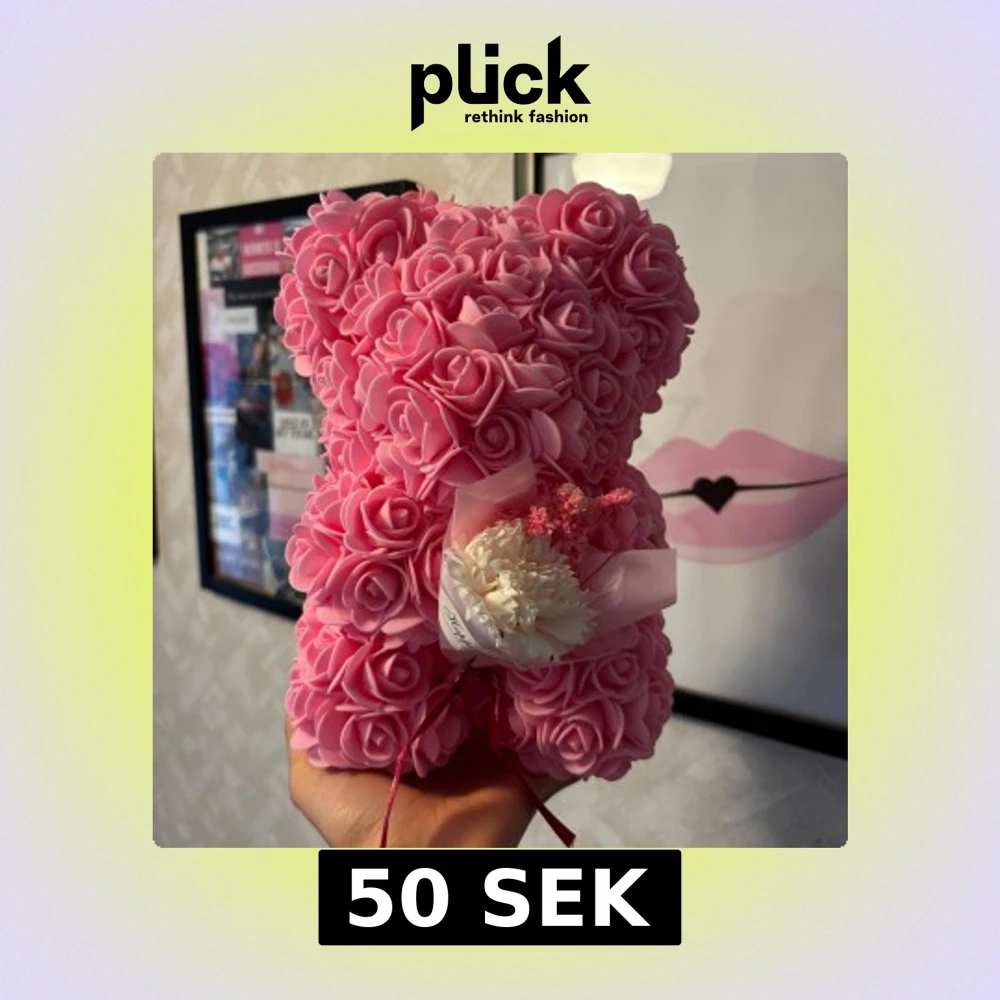 Bilderna visar en söt nallebjörn formad av rosa konstgjorda rosor, dekorerad med en liten bukett blommor. Den är perfekt som present eller dekoration.