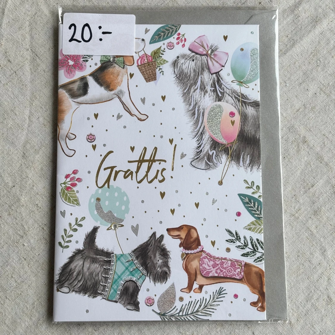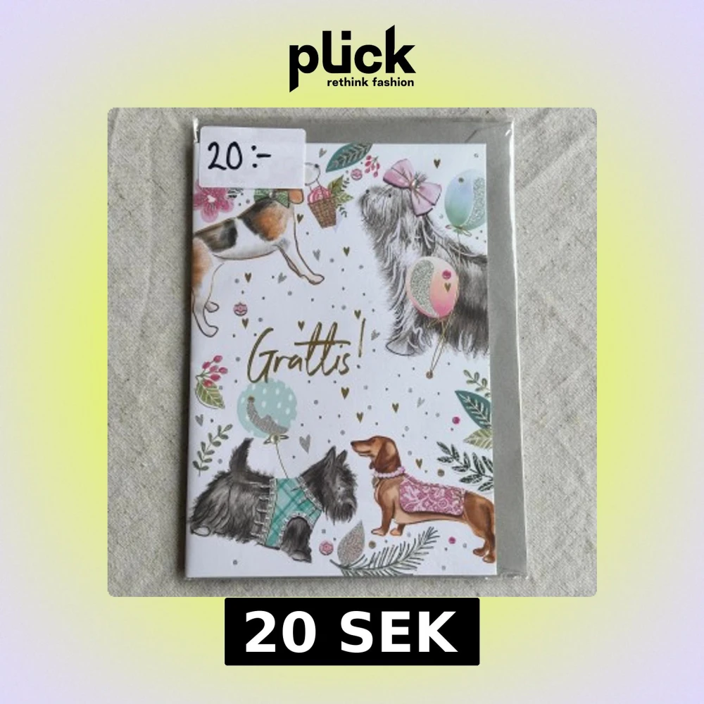 Ett charmigt gratulationskort med färgglada illustrationer av hundar, ballonger och blommor. Medföljer kuvert samt den är kvar i sin ursprungliga förpackning. Insidan består av helt vita blad så plats för mycket text
