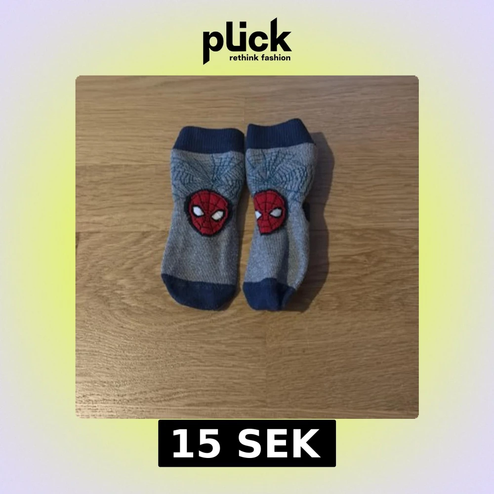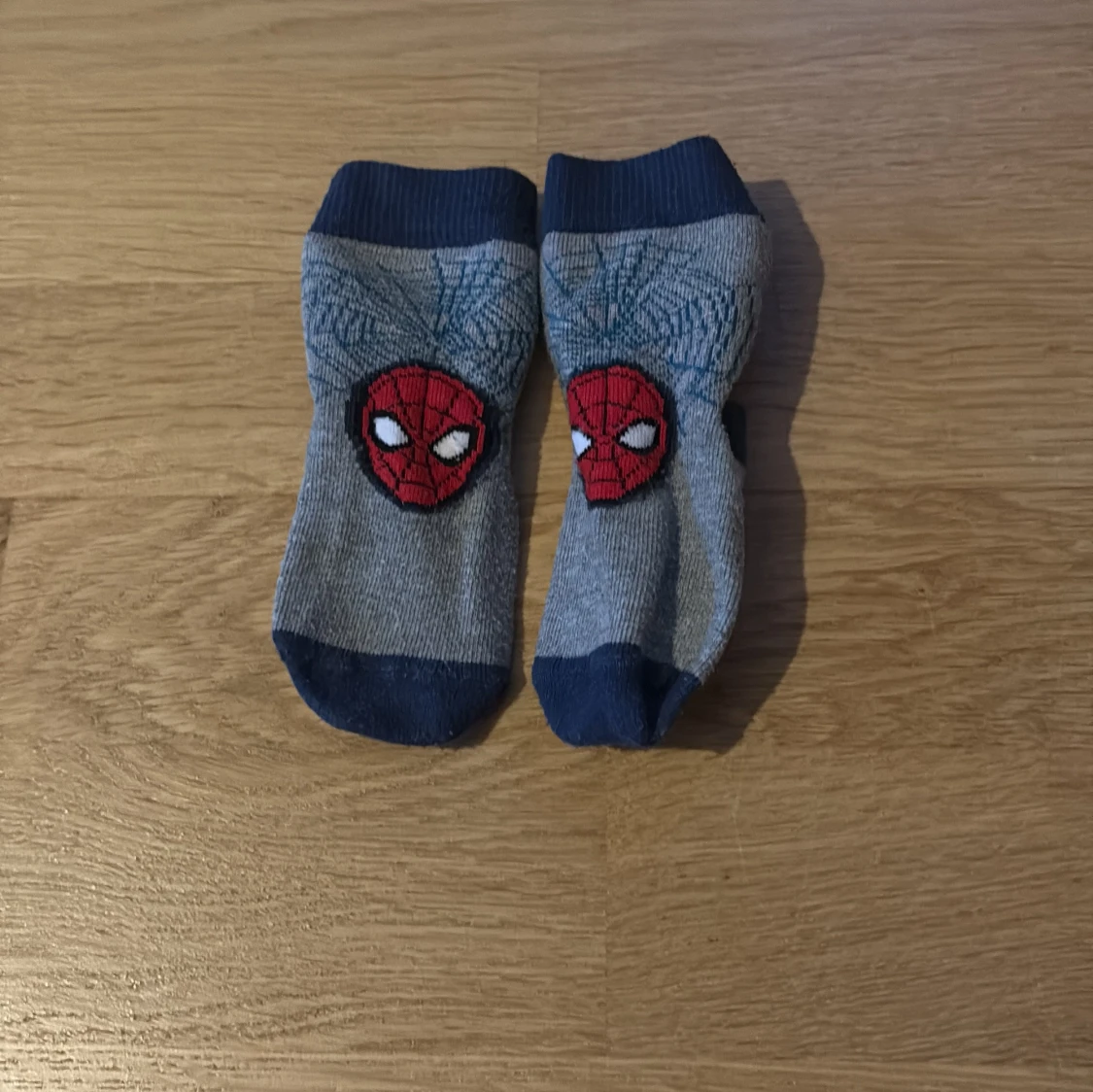 Säljer ett par grå strumpor med mörkblå muddar och tår, prydda med ett broderat Spiderman-ansikte framtill. Perfekta för dig som gillar superhjältar och vill ha något coolt på fötterna. Sköna och mjuka, passar till vardags.