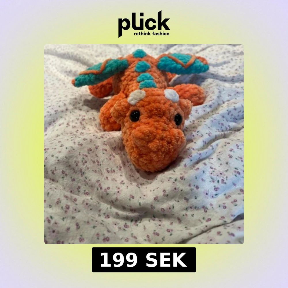 En liten virkad drake i färgerna orange och turkos! Själv så ÄLSKAR jag kontrasten, hoppas ni också gör det! 🧡!Den här innehåller säkerhetsögon som inte rekommenderas för barn under 3 år!
