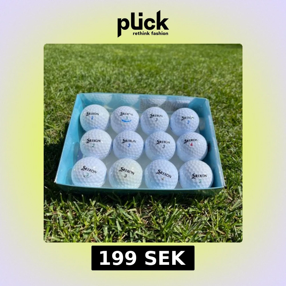 Bilden visar en ask med tolv golfbollar av märket Srixon. Bollarna är i A-klass.