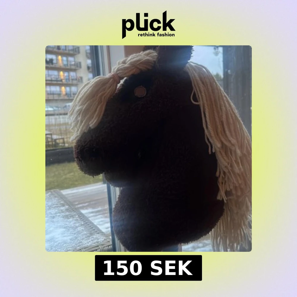 Charmig brun käpphäst med en ljus man i garn. Perfekt för lek och äventyr. Hästen har detaljerade ögon och öron, vilket ger den ett livfullt uttryck. En rolig och kreativ leksak för alla hästälskare!