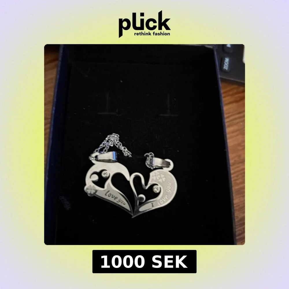 Säljer ett par matchande halsband i silver med delade hjärthängen. Ena delen har texten 'Love you' och den andra 'I love you', båda med små stenar och klöverdetaljer. Perfekt som vänskapssmycke eller till någon du gillar. Och passar best för ett fint par