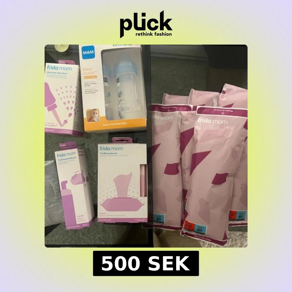Paket med Frida Mom postpartum-produkter (mamma-dusch, trollhasselskum, trollhasselpads, kylpåsar) samt en MAM Easy Active nappflaska. Allt är nytt i förpackning, perfekt för nyblivna mammor och spädbarn. Allting är oanvänt.