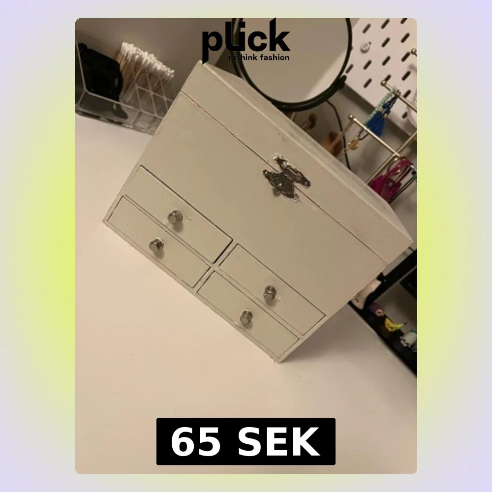 Snyggt smyckeskrin i beige färg med fyra små lådor och ett större fack upptill. Insidan är klädd i rosa och har en unik handmålad detalj på locket. Perfekt för att organisera ringar, halsband, armband och örhängen. Metallbeslag och knoppar ger en cool touch. Smyckeskrinet var rosa förut men målade om det till beige. Och det satt även en liten spegel på in didan som har dragits bort och målats med rosa ovan på.💗