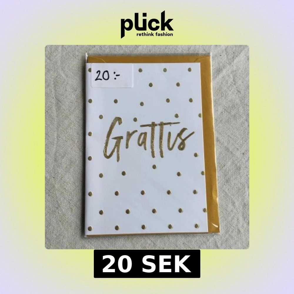 Stilrent och festligt grattiskort med guldfärgade prickar och text. Medföljer kuvert samt den är kvar i sin ursprungliga förpackning. Insidan består av helt vita blad så plats för mycket text