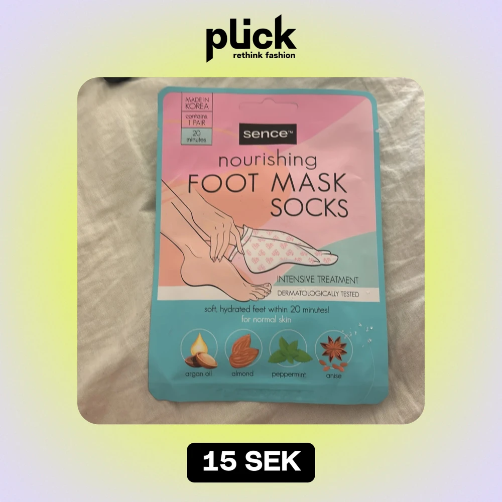 Säljer ett par närande fotmaskstrumpor från Sence. Perfekt för att få mjuka och återfuktade fötter på bara 20 minuter! Innehåller vårdande ingredienser som arganolja, mandel, pepparmynta och anis. Dermatologiskt testade och tillverkade i Korea. Passar normal hud.