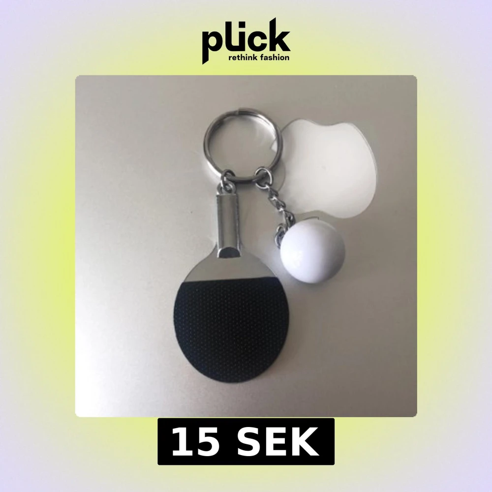 Nyckelring tillsammans med ett svart pingisracket och vit pingisbollđ
