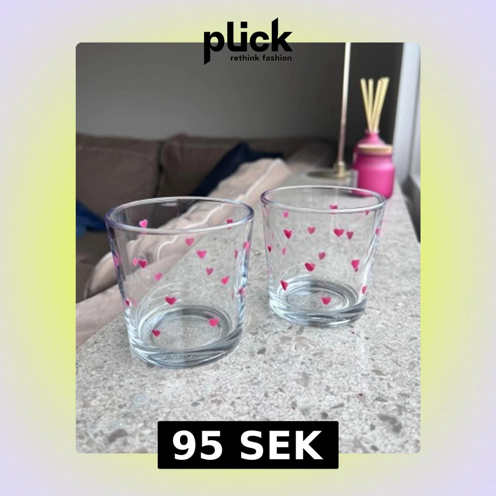 Säljer ett par handmålade glas med rosa hjärtan 💕 Glasen är från IKEA och är i mycket gott skick. Tål mild maskindisk. Måtten är 7,5x7,5cm