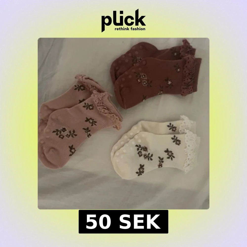 Säljer ett 3-pack söta strumpor med blommigt mönster och spetskant. Färgerna är vit, beige och brunrosa. Strumporna har halkskydd under och är ribbstickade för extra komfort. Perfekta för dig som gillar gulliga detaljer och romantisk stil.oanvända