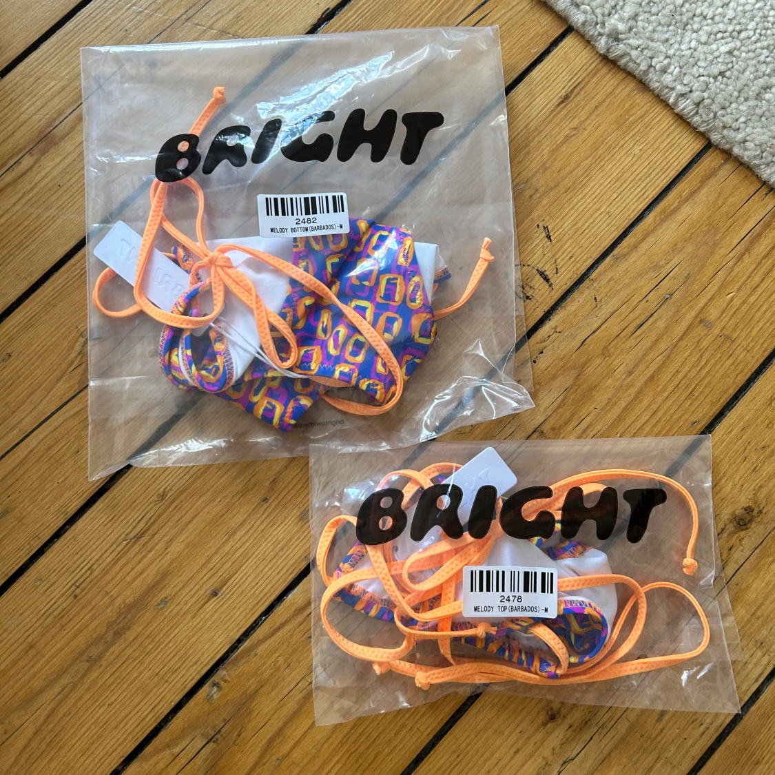 Säljer en färgglad bikini från Bright med blått, orange och gult mönster. Både överdel och underdel har knytband i orange. Klassisk trekantsmodell på överdelen och brazilian underdel💕storlek M på båda delar. Orginalpris 850kr