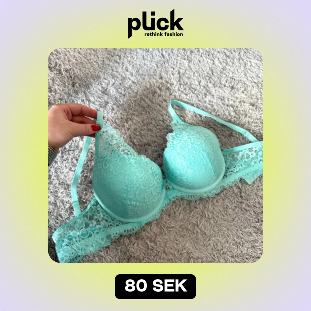 En turkos push up bh i spets, med ett litet guldsmycke i mitten. Spetsen går även upp lite över själva bh’n. Bh’n är aldrig använd, endast testad. Däremot är lappen bortklippt, gjorde de av ren vana, sen användes den aldrig. Rök och djurfritt hem