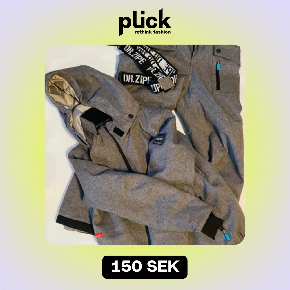 Grått ställ för vintersport/lek. Byxor, jacka, luva och hängslen. Obetydligt använt. Hämtas, Gamla Råslätt, endast swishbetalning