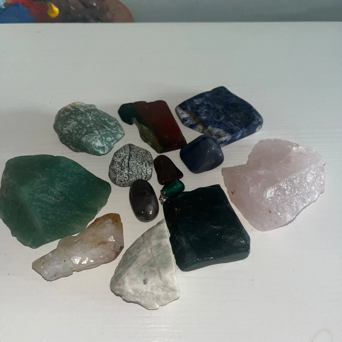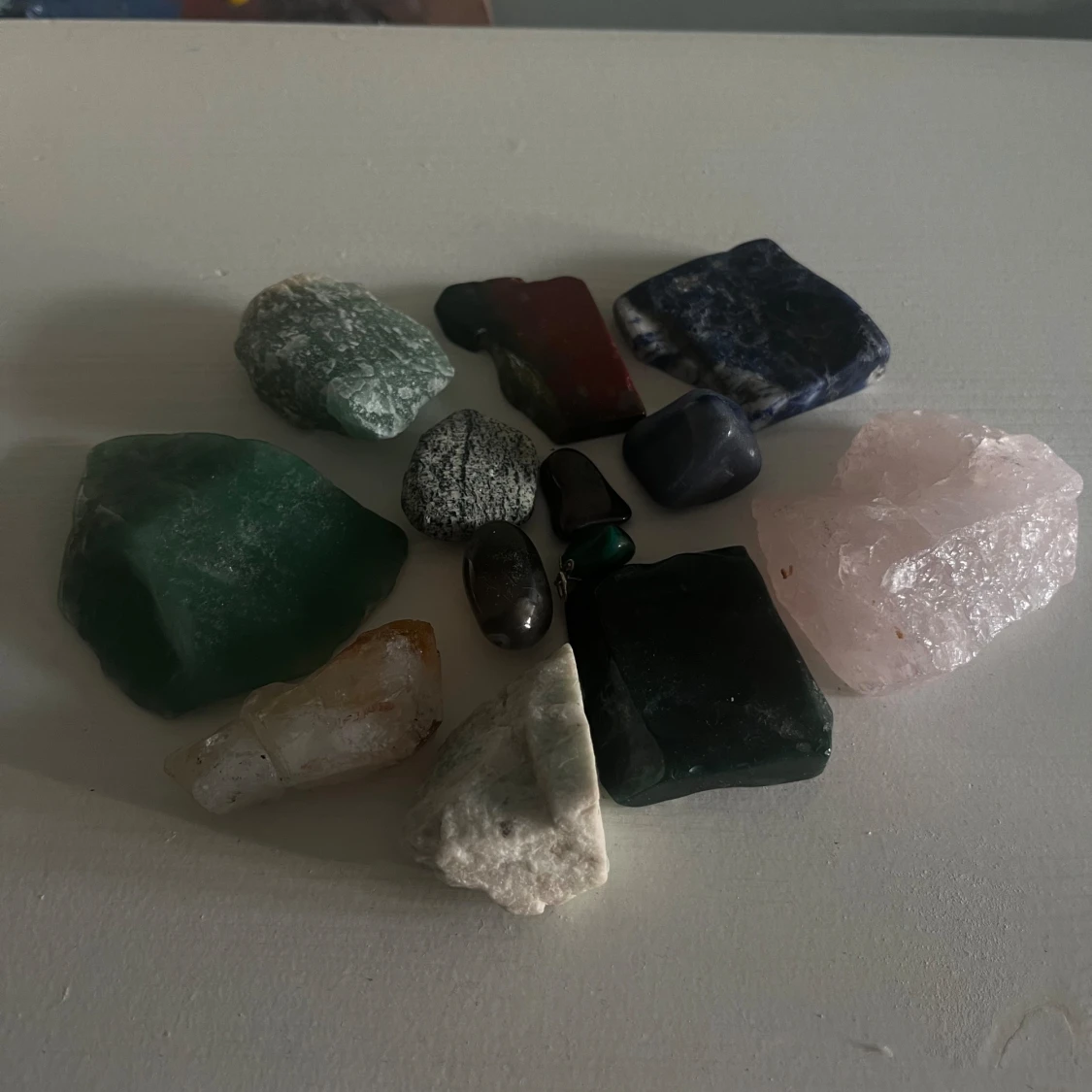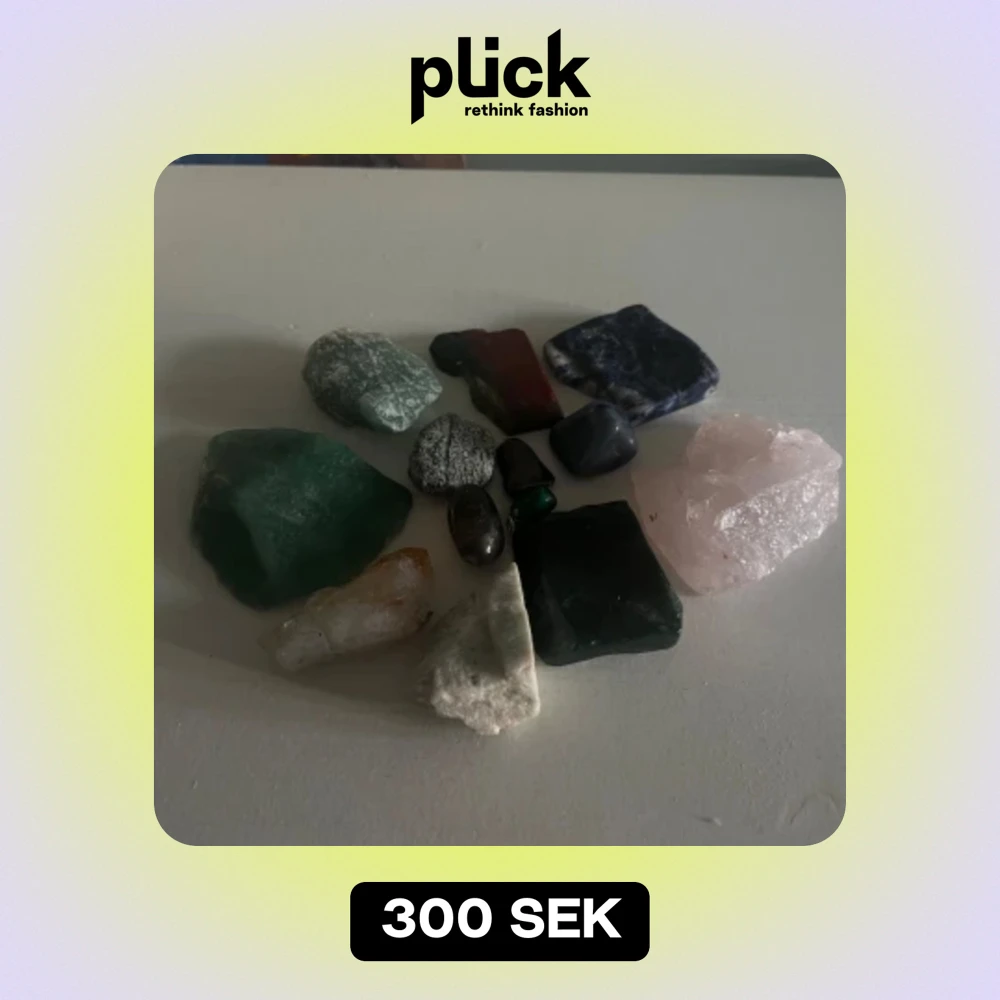 Rosqvartz, smokeyqvartz, amazonit, Angelit, Malakit, Safir, tigerjärn, Unakit. 200kr för alla eftersom att dem köptes enskilt mellan 50 och 300kr. Om du bara vill ha några så kan vi prata pris! :)
